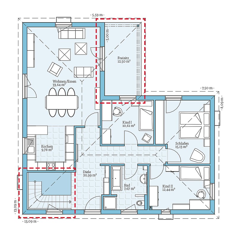 - Kellerabgang (statt Hauswirtschaftsraum/Technik im EG)