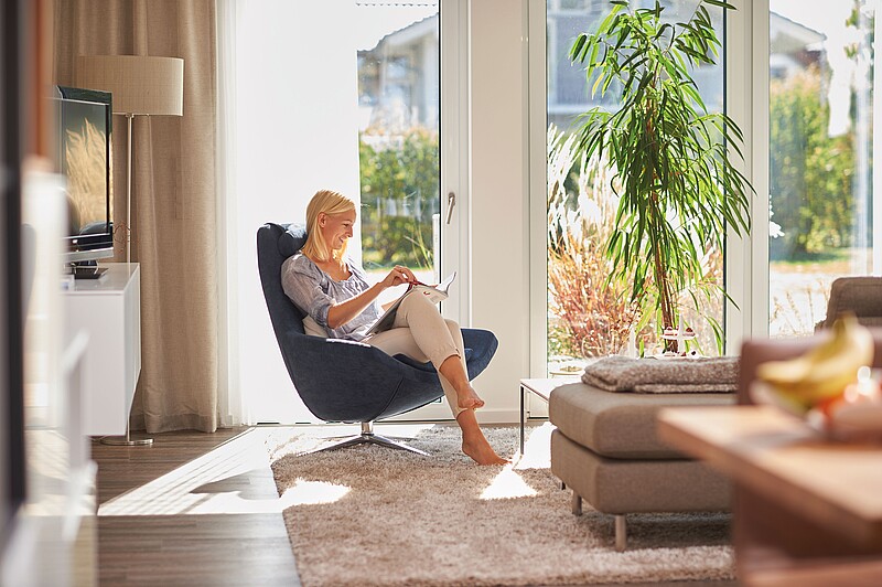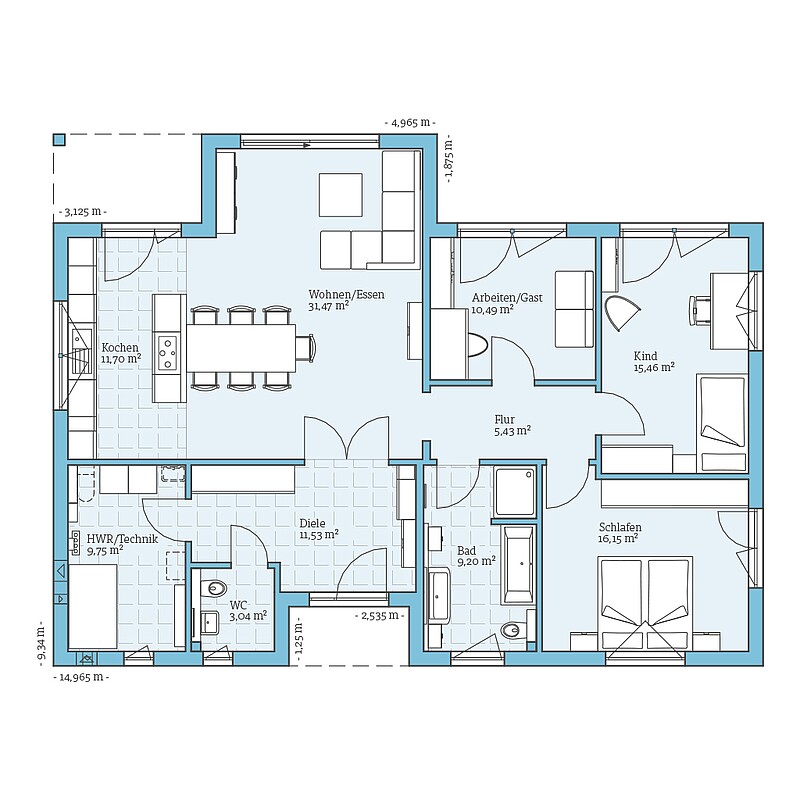 Der Hausentwurf überzeugt mit praktischen Details: Durch die zurückversetzte Haustür entsteht ein wettergeschützter Eingang. In der Diele sind ein WC und viel Platz für eine Garderobe eingeplant und der Technikraum ist so dimensioniert, dass dort genug Fläche für Waschmaschine, Trockner und Co. zur Verfügung steht. Im Zentrum des hellen Ess- und Kochbereichs kann ein großer Tisch platziert werden – hier fühlen sich Freunde und Familie richtig wohl! Das Wohnzimmer als gemütliche Rückzugsmöglichkeit ist in einem Anbau untergebracht. Über einen Flur gelangt man vom Wohnbereich aus zum Bad und zu den Schlafzimmern.