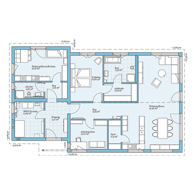Mit Freunden oder Familie unter einem Dach leben und trotzdem einen eigenen Bereich zur Verfügung haben – das funktioniert auch im Bungalow. Auf einer Ebene sind in unserem Hausentwurf gleich zwei Wohneinheiten untergebracht.