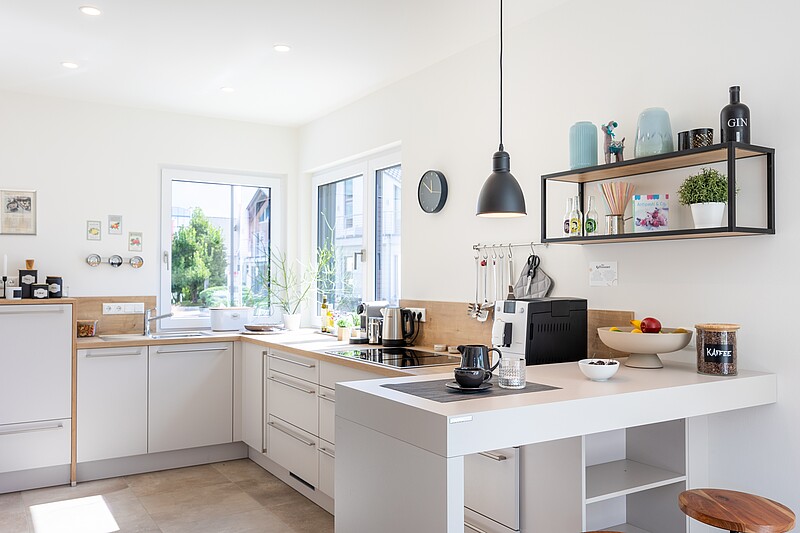 Im Erdgeschoss beeindruckt der mit fast 50 m² riesige Wohn- und Kochbereich. Seine grossen Fensterflächen lassen auch im Winter wohltuende Sonnenstrahlen ins Haus und durchfluten den Raum mit Licht.