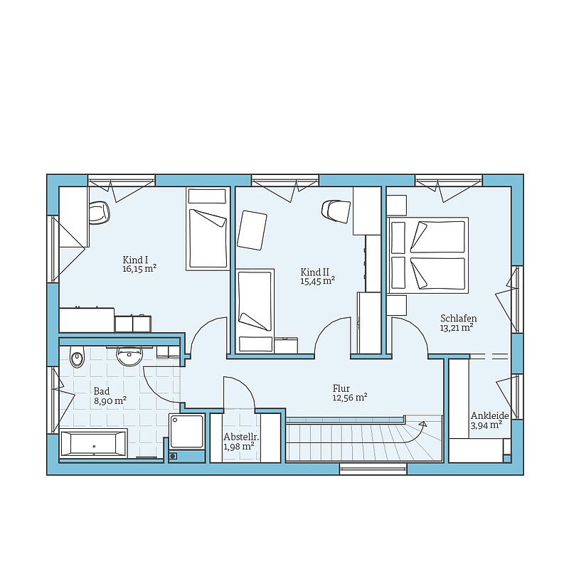 Die Schlafräume sind im Obergeschoss untergebracht. An das Elternschlafzimmer grenzt ein eigenes Ankleidezimmer.