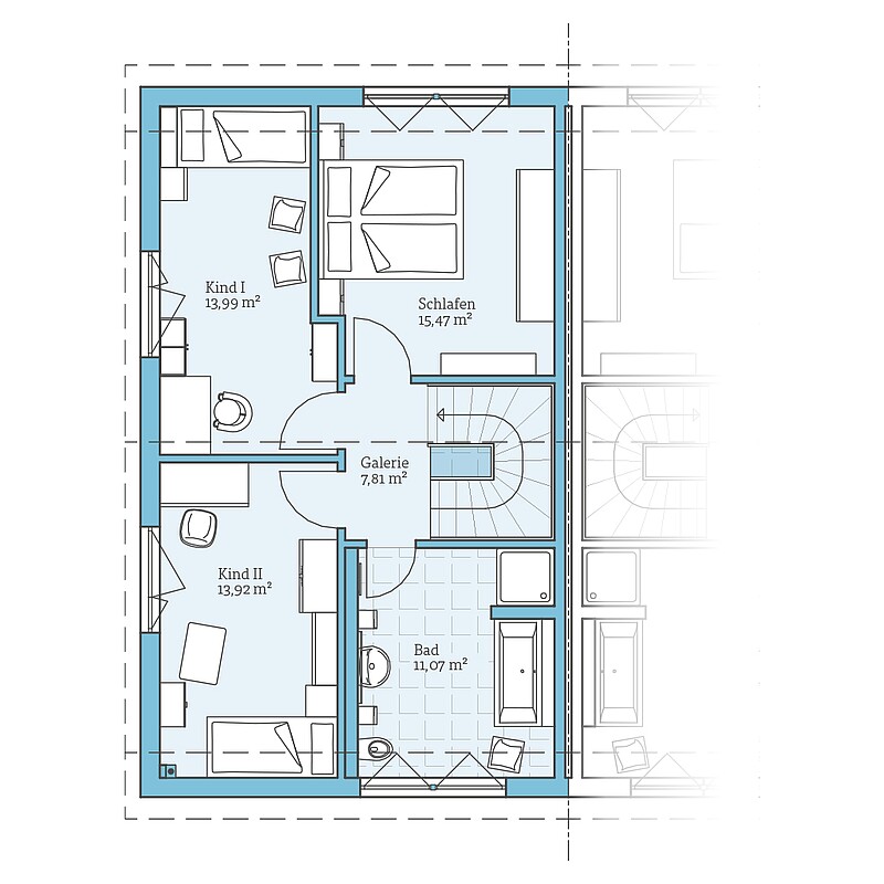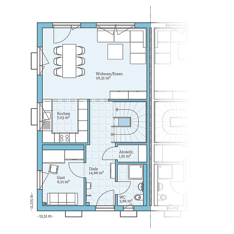 Jede Doppelhaushälfte hat 125 m² Nettogrundfläche und kann auf Wunsch mit einem Keller ergänzt werden. Im Keller ist dann auch der beste Platz für die Haus- und Heiztechnik, so dass im Erdgeschoss Raum für ein Gäste- oder Arbeitszimmer frei wird.