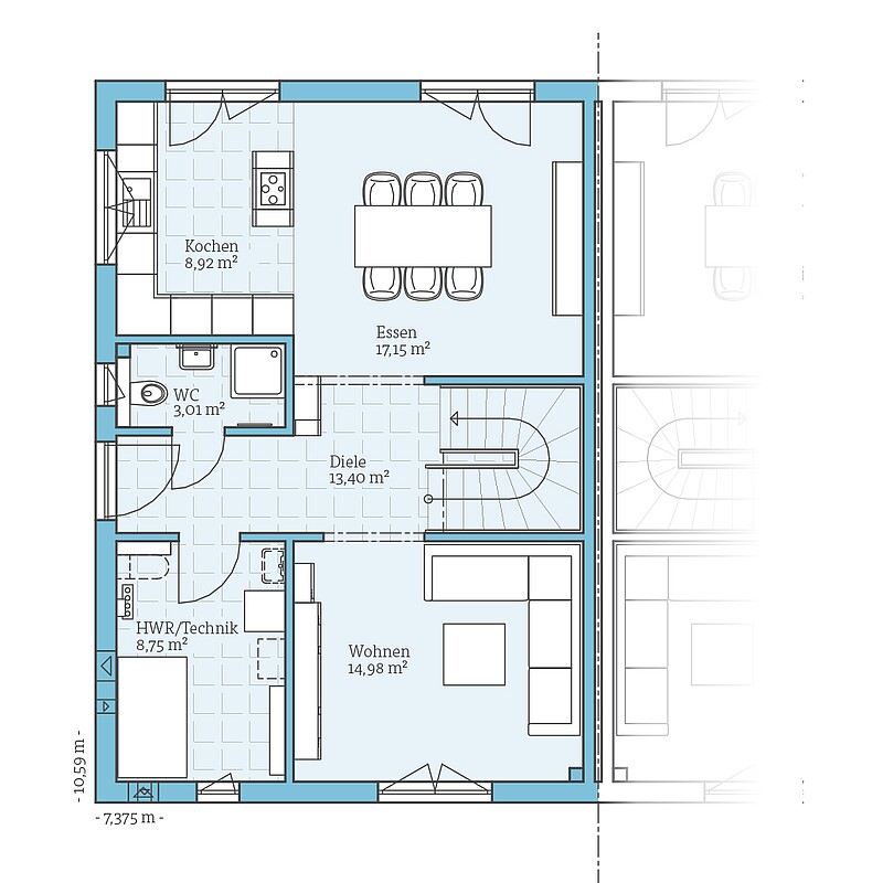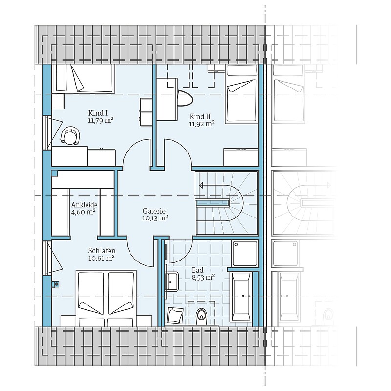 Der Fertighaus Entwurf Doppelhaus 45-123 bietet im Erdgeschoss einen grossen offenen Koch- und Essbereich, der als kommunikative Wohnküche gestaltet ist und den Mittelpunkt des Familienlebens bildet. Ein separates Wohnzimmer, ein Hauswirtschafts- und Technikraum sowie das Gäste-WC runden das Raumangebot im Erdgeschoss ab. Im Dachgeschoss stehen zwei Kinderzimmer, das Elternschlafzimmer mit Ankleidezimmer und ein Familienbad zur Verfügung.