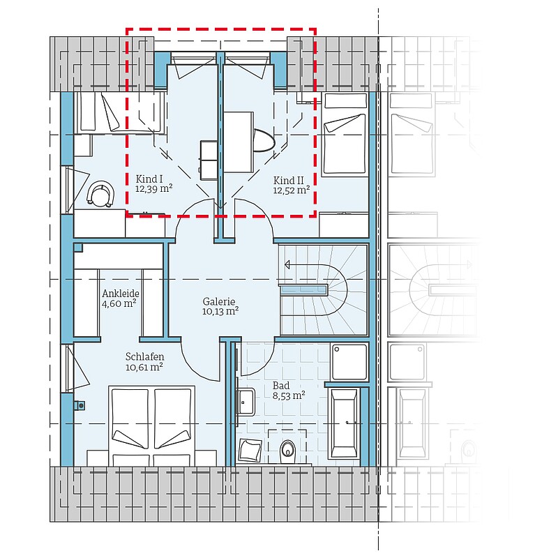 Die insgesamt 123 m² dieses Doppelhauses können mit dem optionalen Zwerchgiebel noch erweitert werden.
