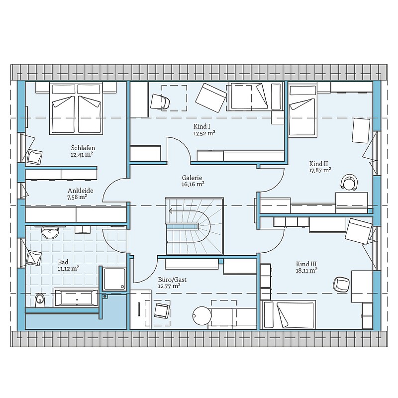 Das Dachgeschoss ist sehr grosszügig gestaltet und erweitert so die Wohnfläche der Hauptwohnung, da es sich über das komplette Erdgeschoss erstreckt. Es ist dort Platz für drei Kinderzimmer, ein Gäste- oder Arbeitszimmer, das Elternschlafzimmer mit Ankleide sowie ein Familienbad.