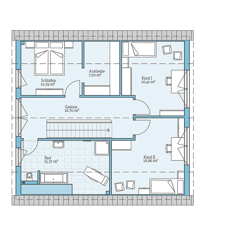 Auch der optionale Zwerchgiebel macht diesen Hausentwurf zu einem flexibel planbaren Allround-Talent: Das grosse Familienbad im Dachgeschoss und eines der beiden geräumigen Kinderzimmer werden nicht nur um 1,5 Quadratmeter erweitert, sondern erhalten zusätzlich noch eine Extraportion Tageslicht.
