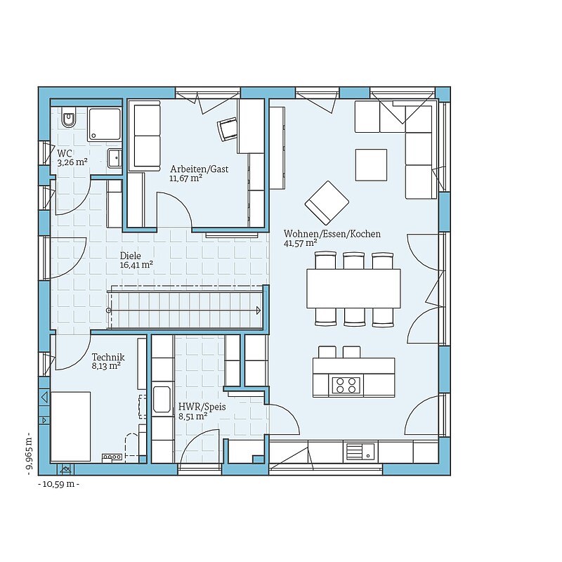 Besonders praktisch: In einem zusätzlichen Raum, der direkt an die offene Küche anschliesst, ist eine Kombination aus Speisekammer und Hauswirtschaftsraum eingeplant. So gelingt es, tägliche Wege im Haus zu verkürzen.