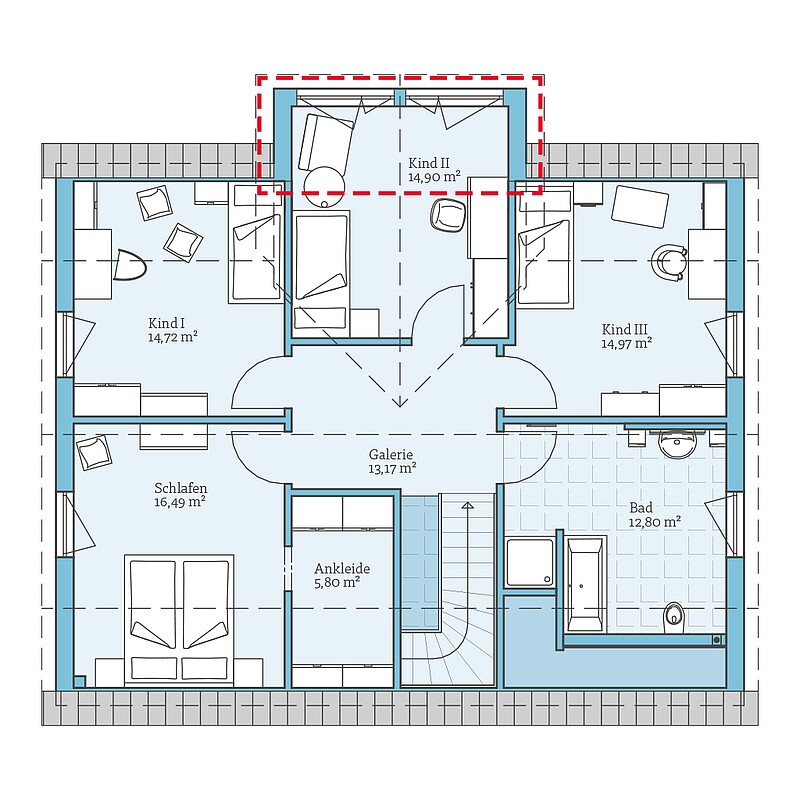 Im Erdgeschoss erzeugt die helle und freundliche Gestaltung des offenen Wohn-, Ess- und Kochbereichs eine angenehme Wohnatmosphäre. Im Dachgeschoss stehen drei Kinderzimmer, das Familienbad und das Elternschlafzimmer mit Ankleide zur Verfügung.