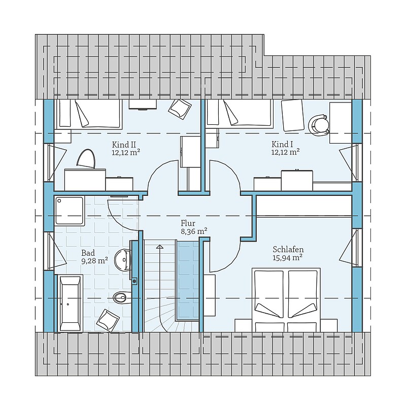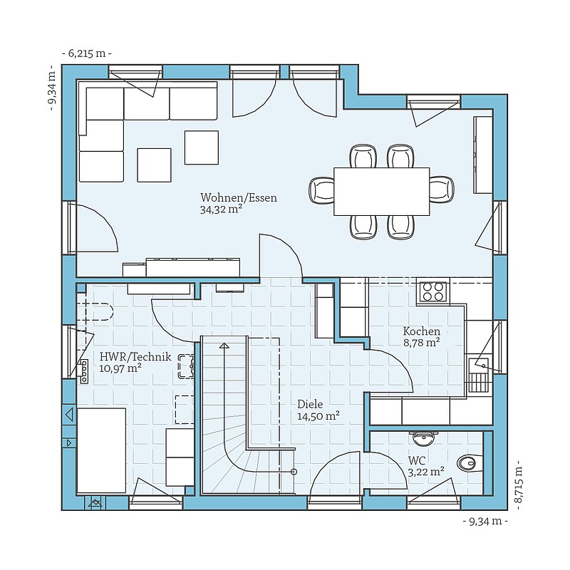 Durch die offene Gestaltung des Grundrisses wirkt gerade das Erdgeschoss trotz der kompakten Aussenmasse wesentlich grösser. Auch auf einen praktischen Hauswirtschaftsraum und ein separates Gäste-WC müssen Sie nicht verzichten.