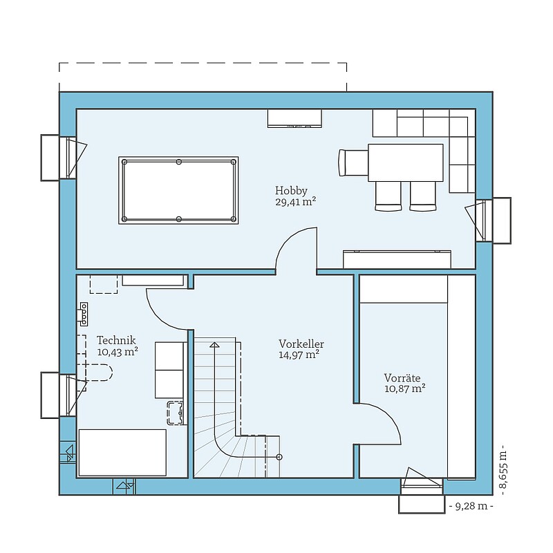 - Keller mit Heiztechnik, Hobbyräumen, Vorratsräumen oder Werkstatt