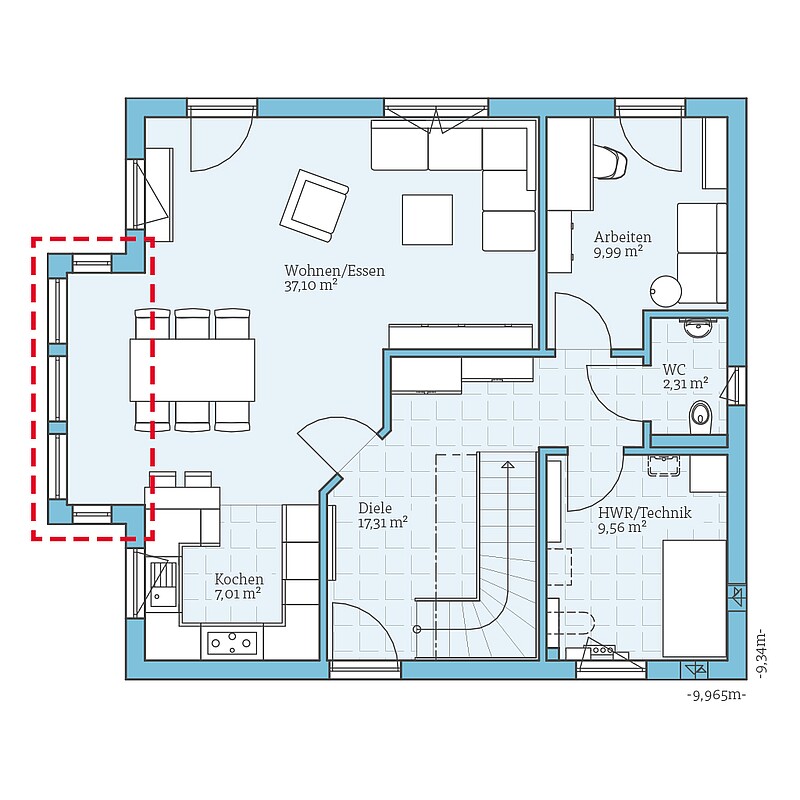 Das zusätzliche Arbeits- und Gästezimmer im Erdgeschoss kann bei Bedarf als drittes Kinderzimmer genutzt werden. Besonders praktisch: In das angrenzende Gäste-WC lässt sich sogar noch eine Dusche integrieren. Ideal für Teenager, die schon mal gerne länger das Bad blockieren.