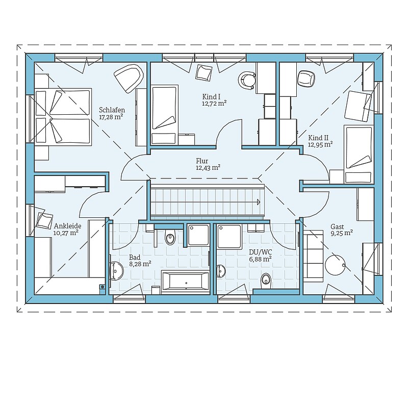 Mit den insgesamt vier Schlafzimmern, einem Gäste- oder Arbeitszimmer, zwei Duschbädern und dem geräumigen Familienbad wird bei diesem Villen-Entwurf der Wunsch nach Raum zum Leben perfekt erfüllt.