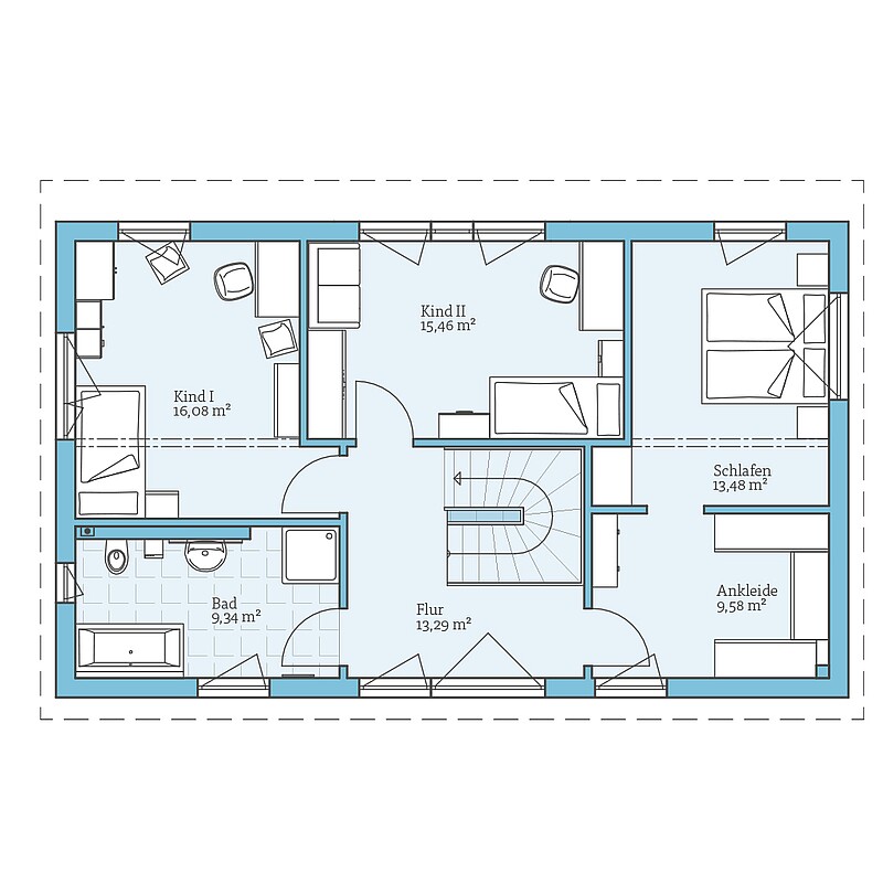 So finden beim Entwurf Vita 156 z. B. im Obergeschoss neben dem Elternschlafzimmer auch noch zwei Kinderzimmer, ein Bad und ein Ankleidezimmer für die Eltern Platz.