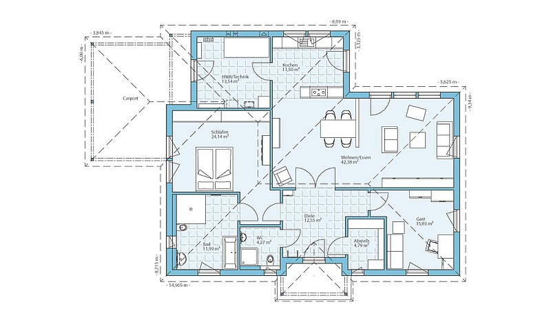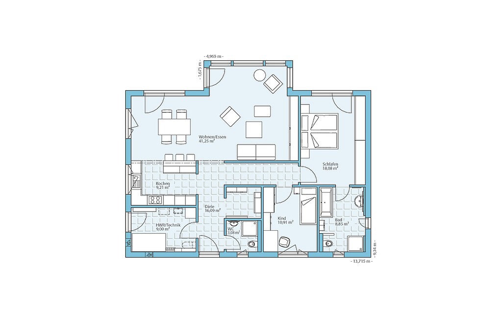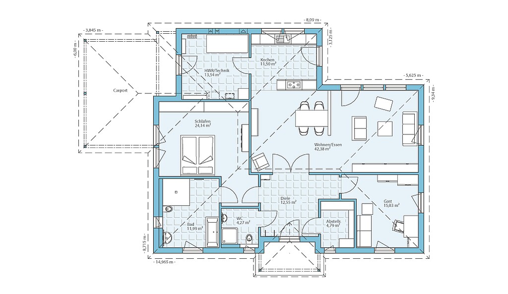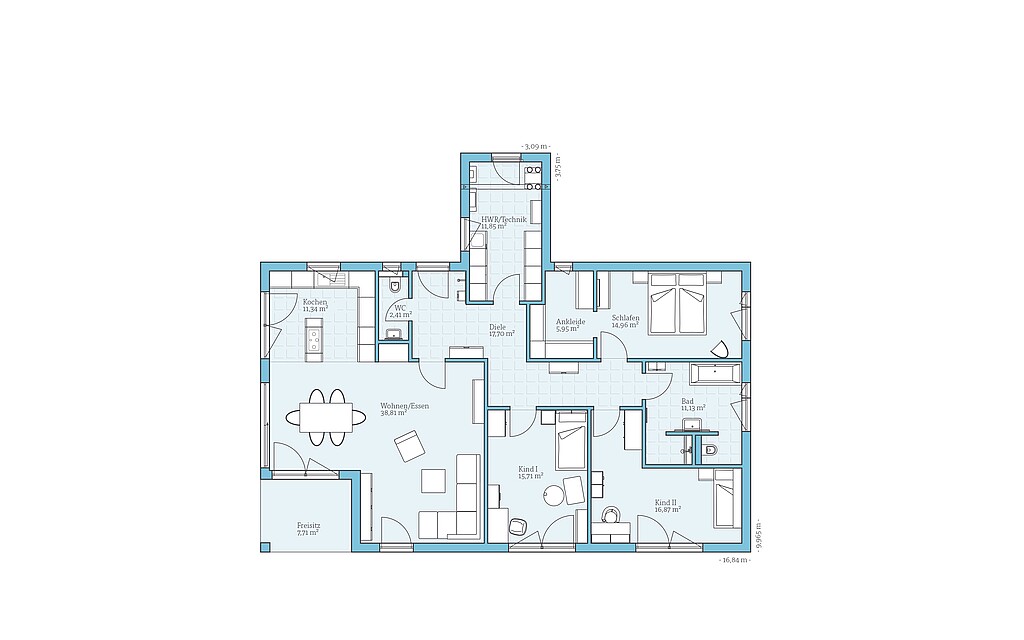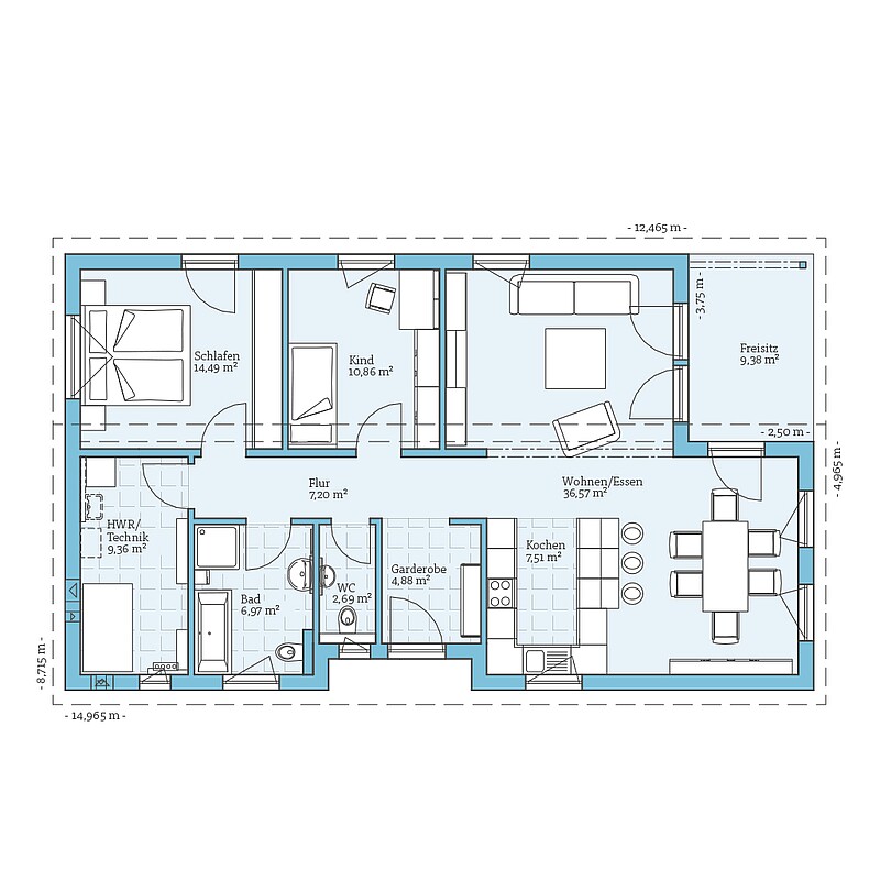 Außerdem ist die Aufteilung der Räume variabler und die Lebensbereiche können räumlich besser voneinander getrennt werden.