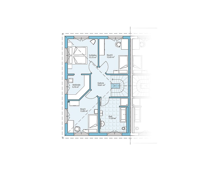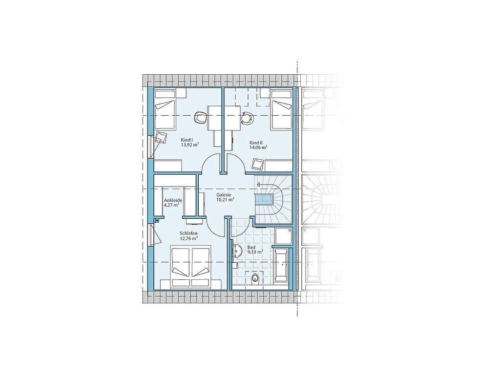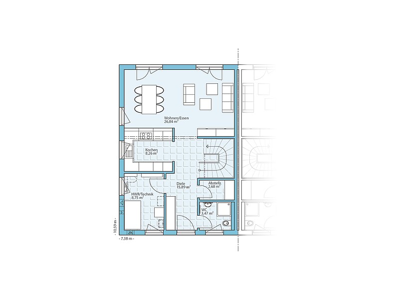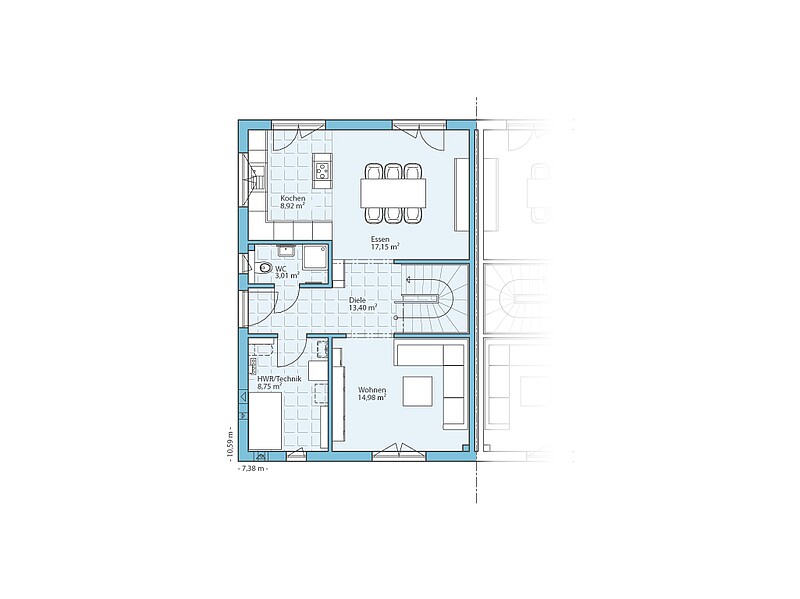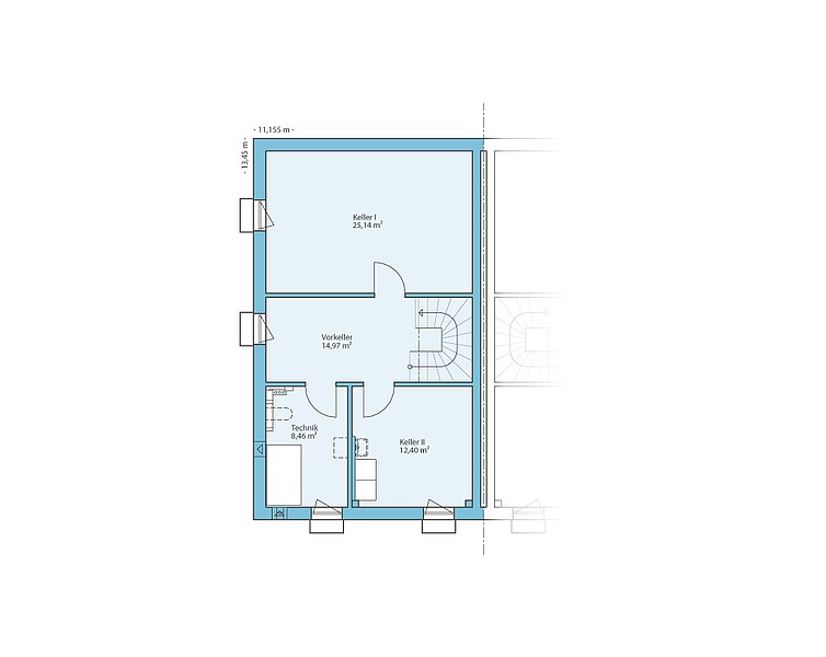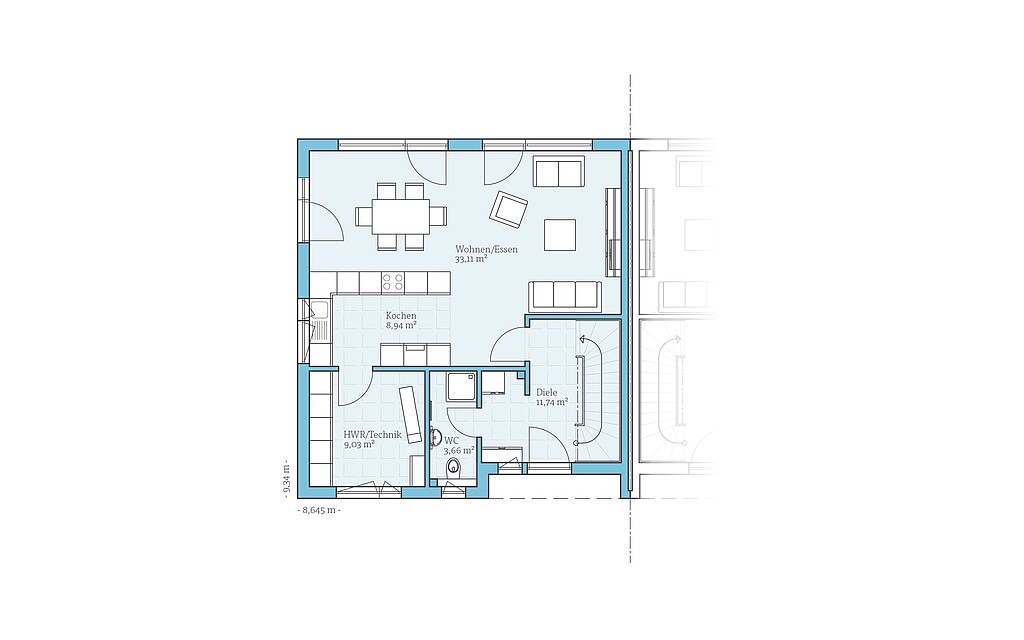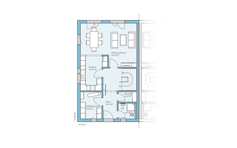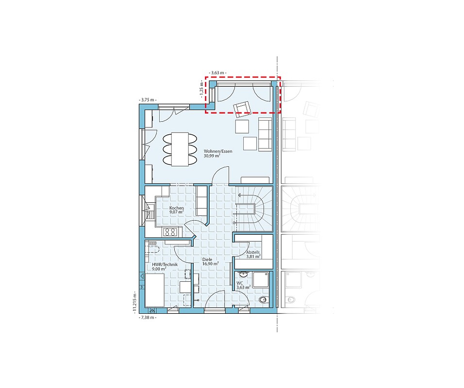 - Eine der vier Aussenwände ist fensterlos. Hier werden vorzugsweise Eingangsbereich, Treppen, Abstellräume oder die Toilette untergebracht.