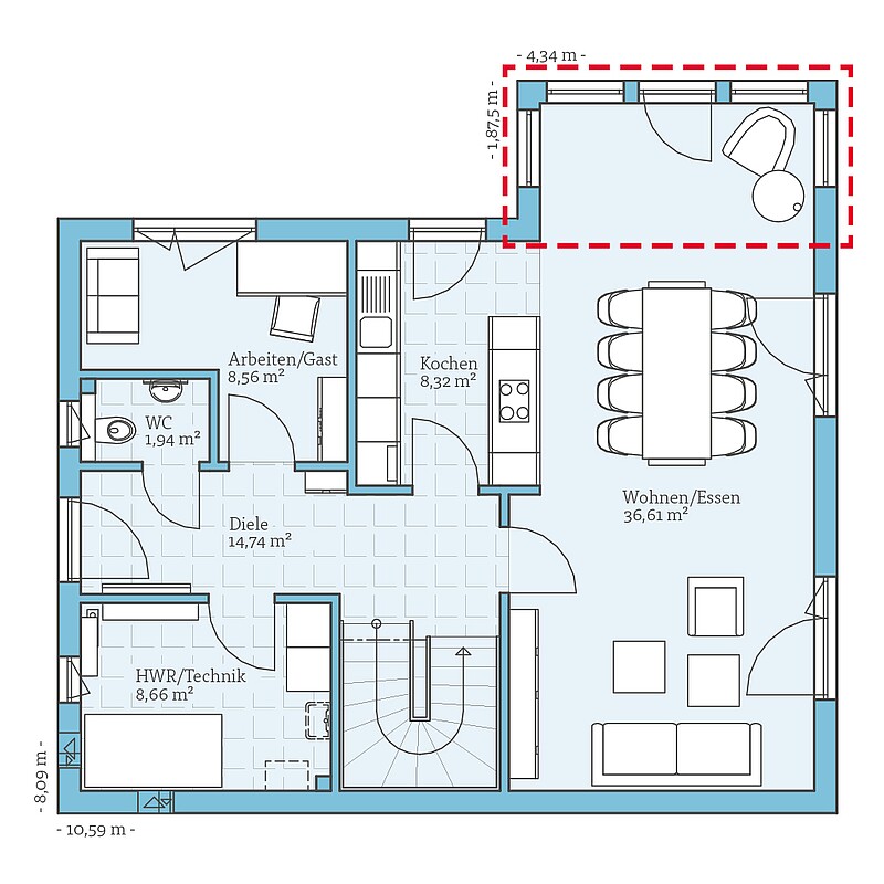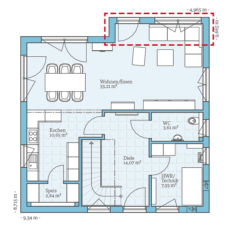 - im Alter kann dieser Teil problemlos zu einer Einliegerwohnung umfunktioniert werden.