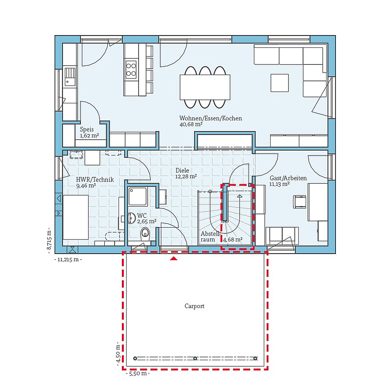 - Planen Sie ohne Keller ist es oft ratsam, einen Raum im Haus als Stauraum zu nutzen. Es gibt aber noch weitere Möglichkeiten, Dinge zu verstauen. Beispiele hierfür sind Einbauschränke unter der Treppe oder halb offene Zwischenebenen bei hohen Decken im zweiten Stock. Auch Stauräume außerhalb des Hauses wie eine Garage, Geräteraum hinter dem Carport oder ein Gartenhäuschen sind denkbar.