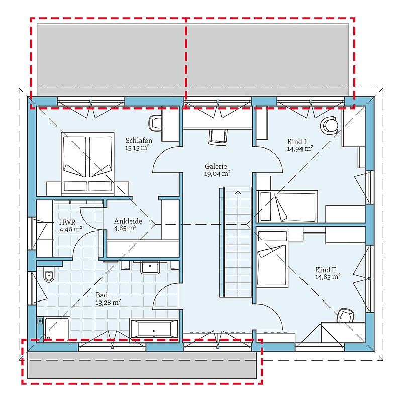 Derzeit im Trend liegt ein separater Elternbereich im Obergeschoss bestehend aus Schlafzimmer, Ankleide, Bad und eventuell einem Hobbyraum oder einer Sauna, der im Gesamten durch eine Tür vom restlichen Haus abgetrennt ist. Die Vorteile hierbei sind