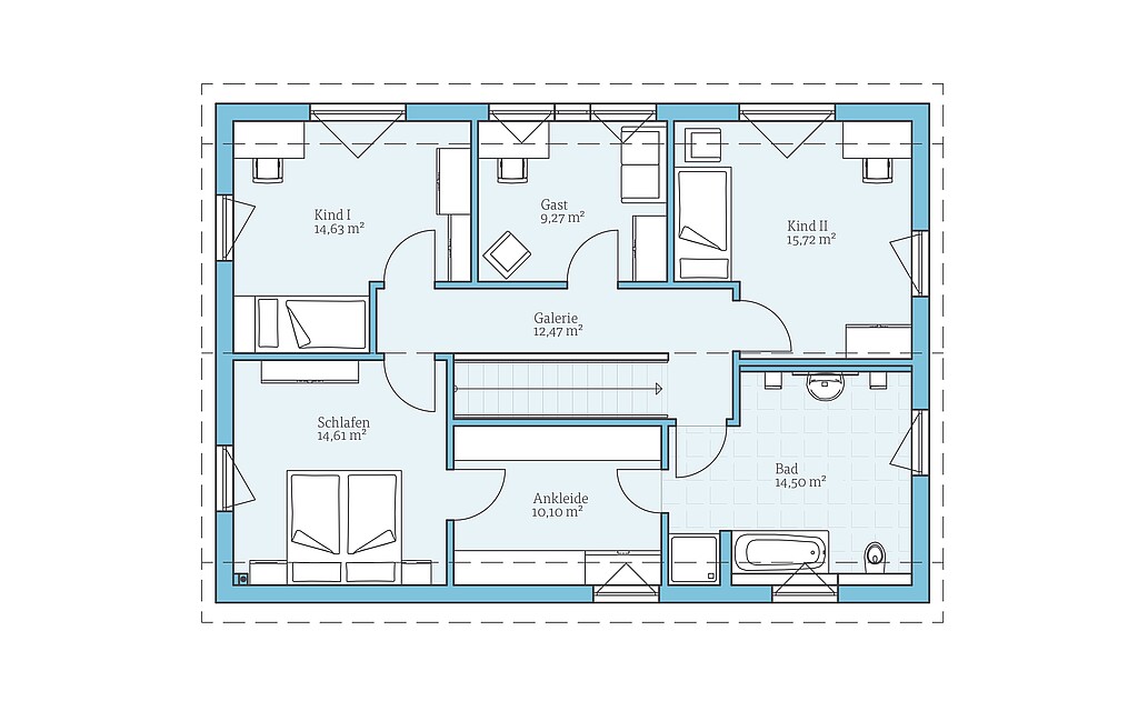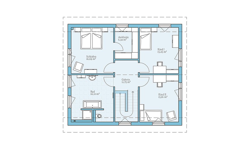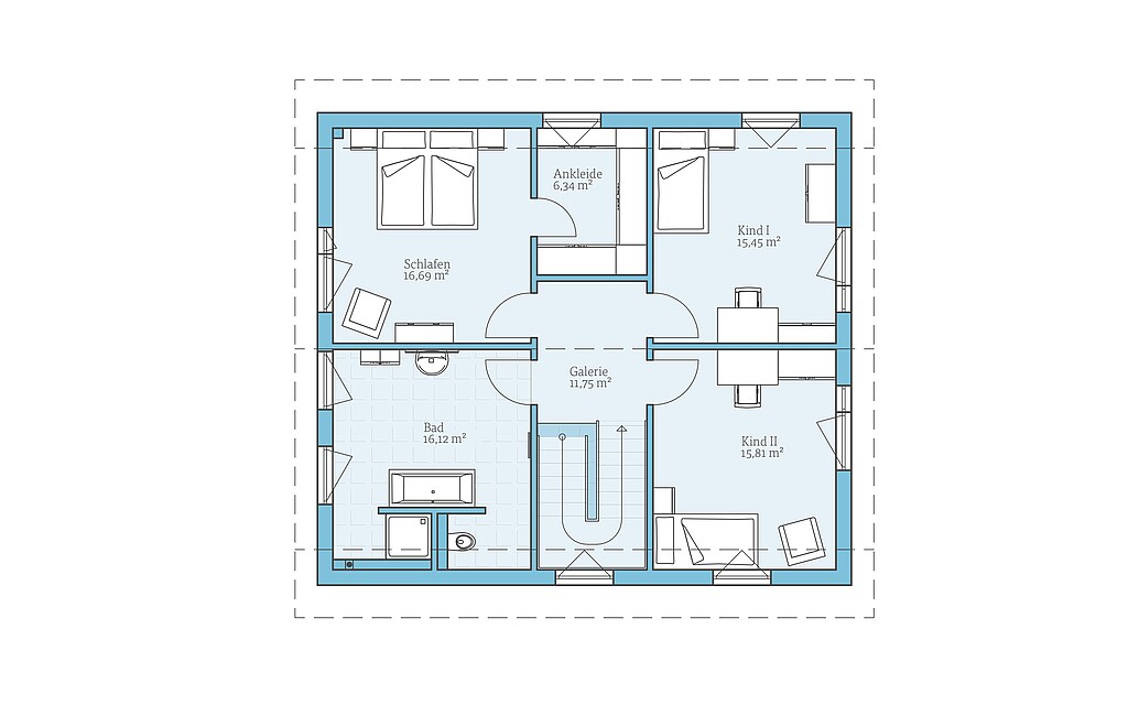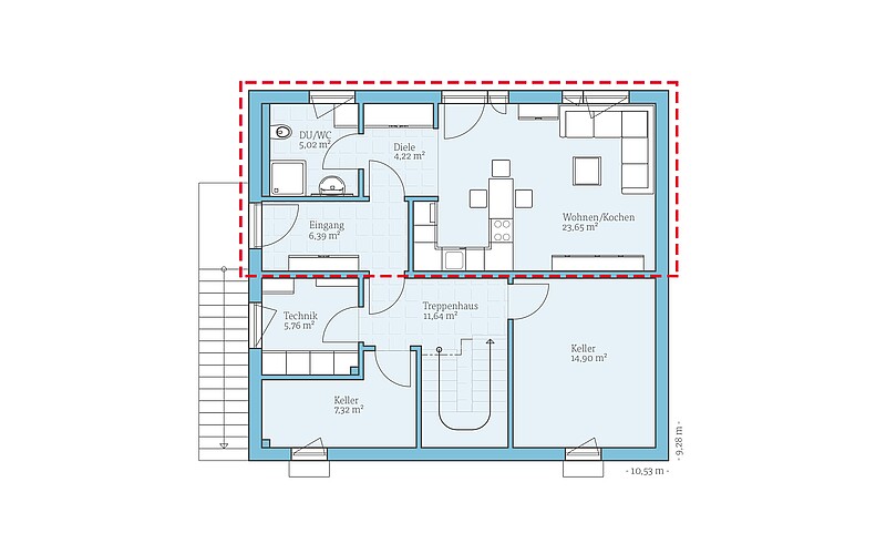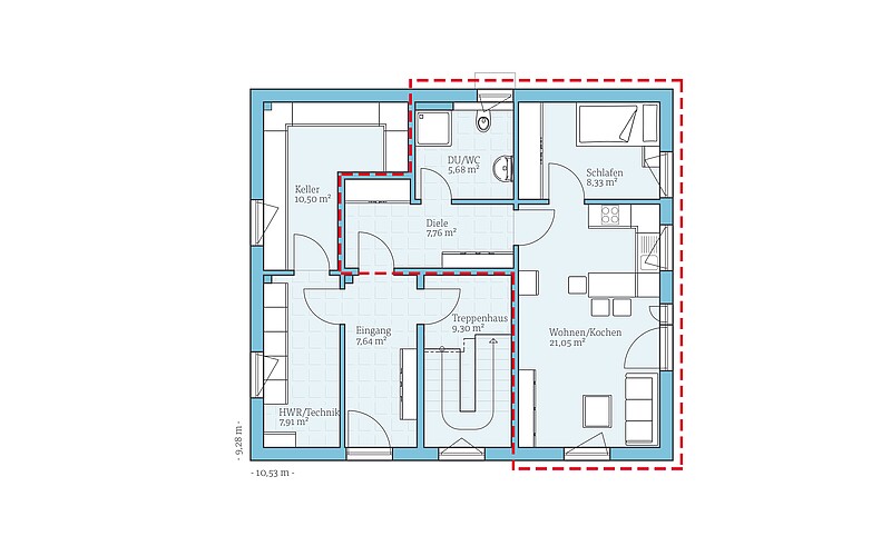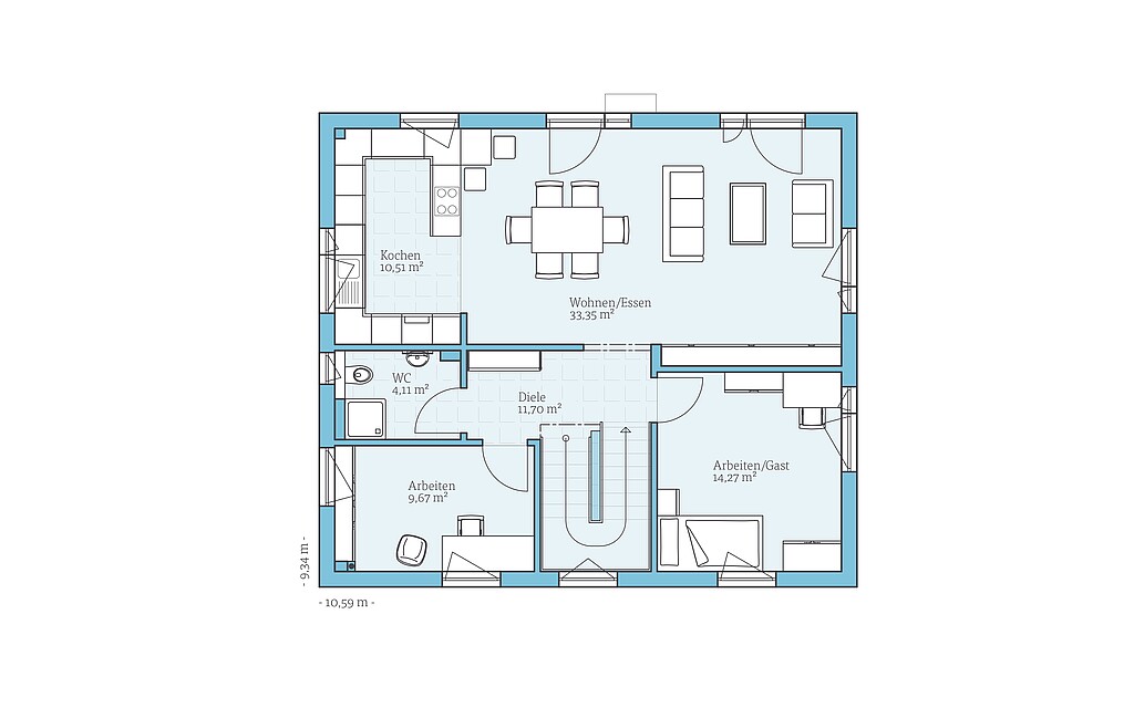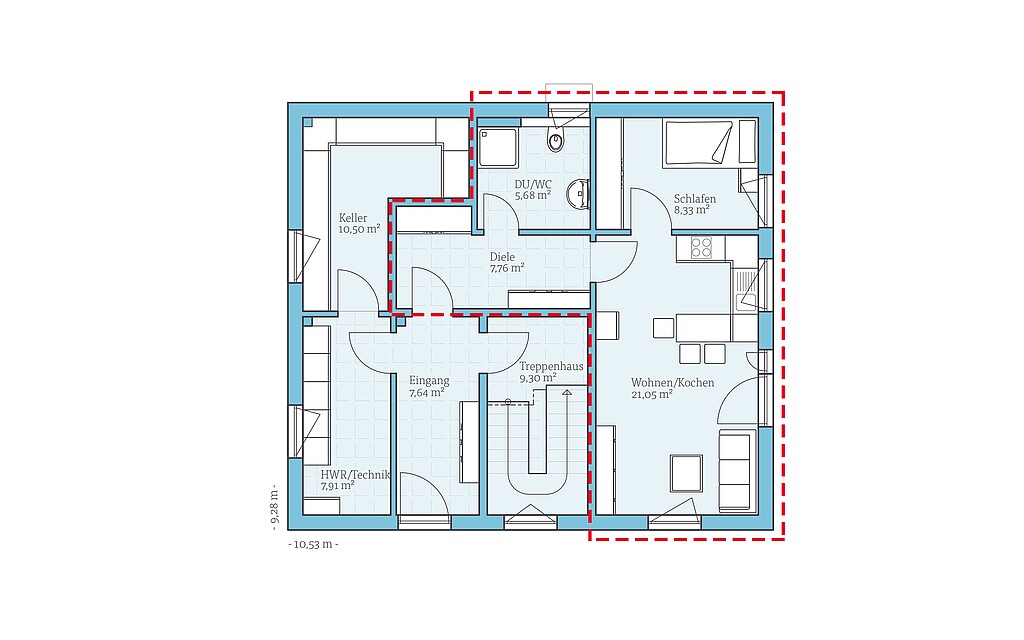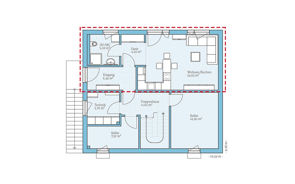 - Der Grundriss des Haupthauses kann wie ein herkömmlicher Einfamilienhausgrundriss mit kleinem Keller geplant werden.