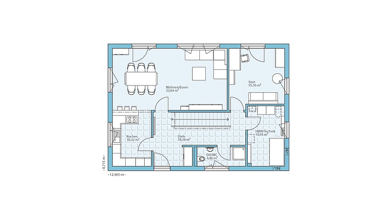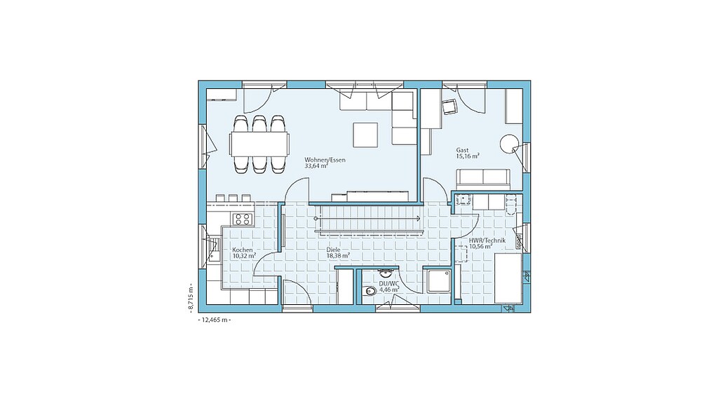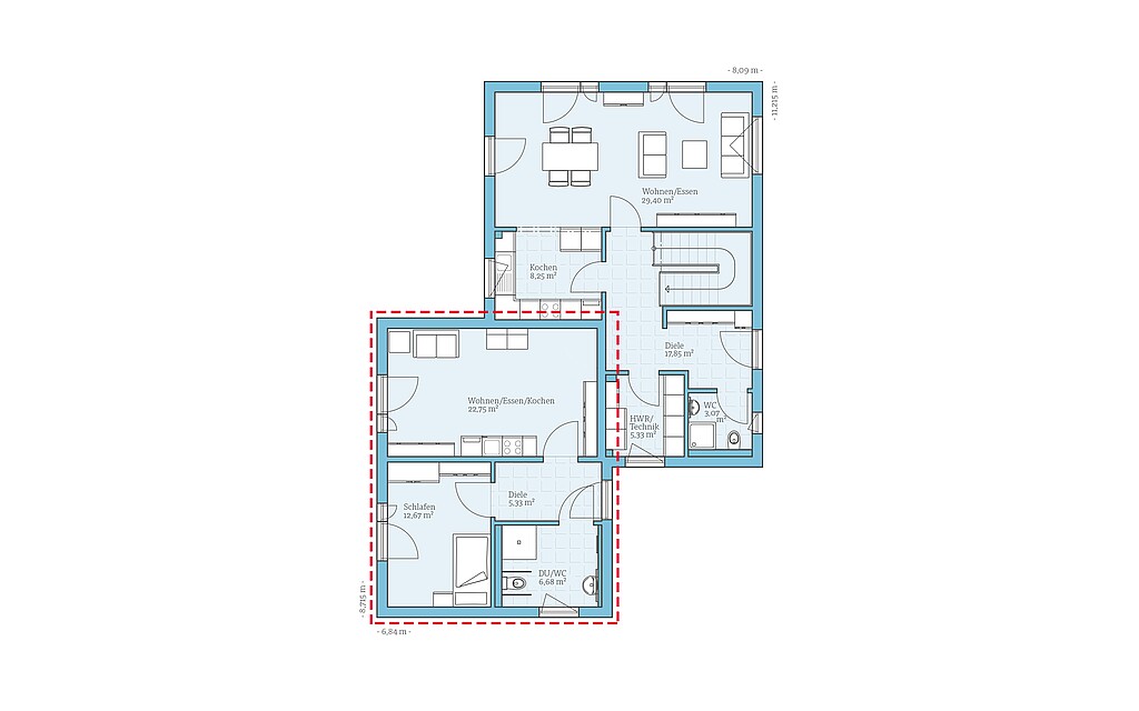 - Gemeinsamer Eingangsbereich und gemeinsamer Technikbereich sparen Nutzfläche ein, wodurch die Wohnfläche im Haus größer wird.