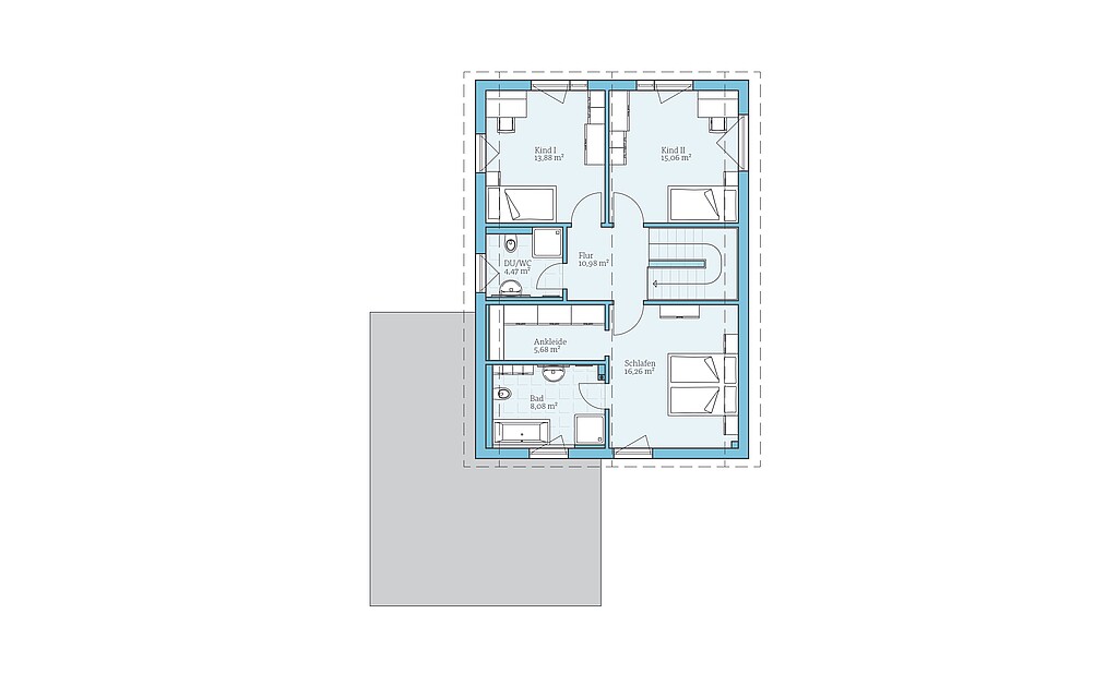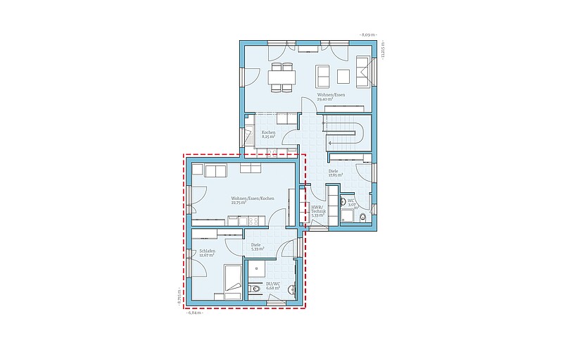 Dieser Grundriss zeigt, wie eine Einliegerwohnung innerhalb eines rechteckigen Hauses eingeplant werden kann. Vor allem bei Planungen ohne Keller, bei dem kein Anbau gewünscht oder möglich ist, ist dies eine beliebte Variante.