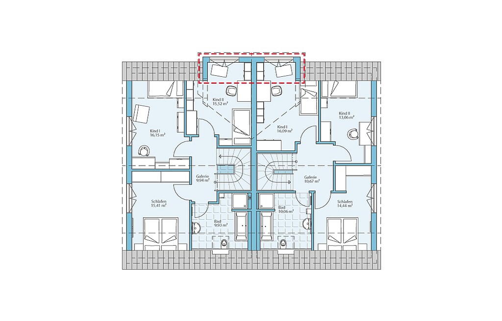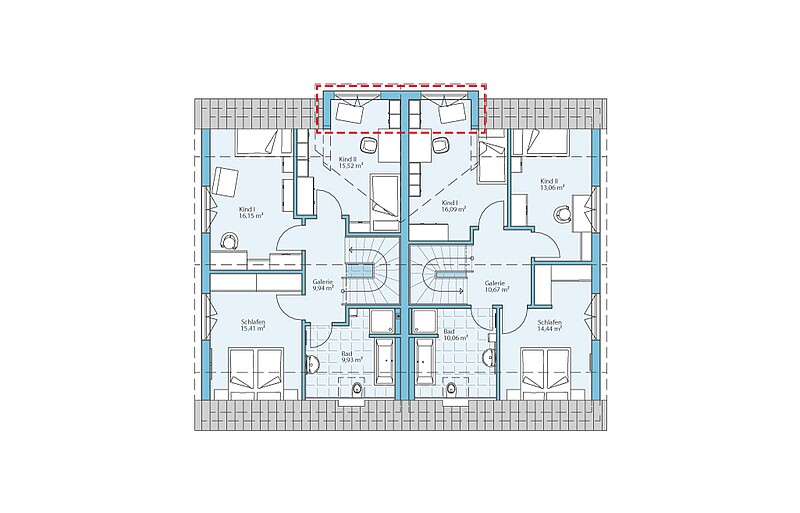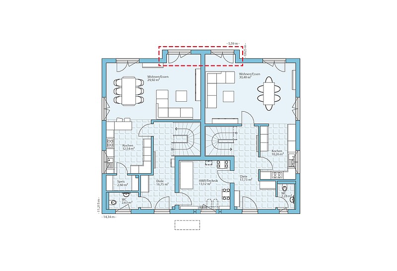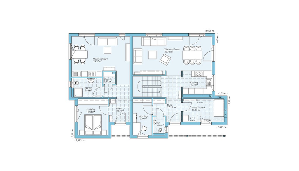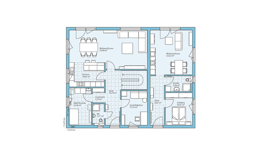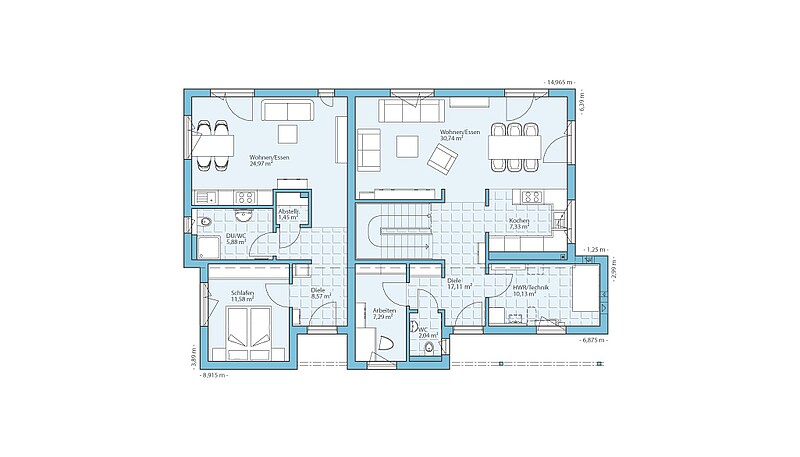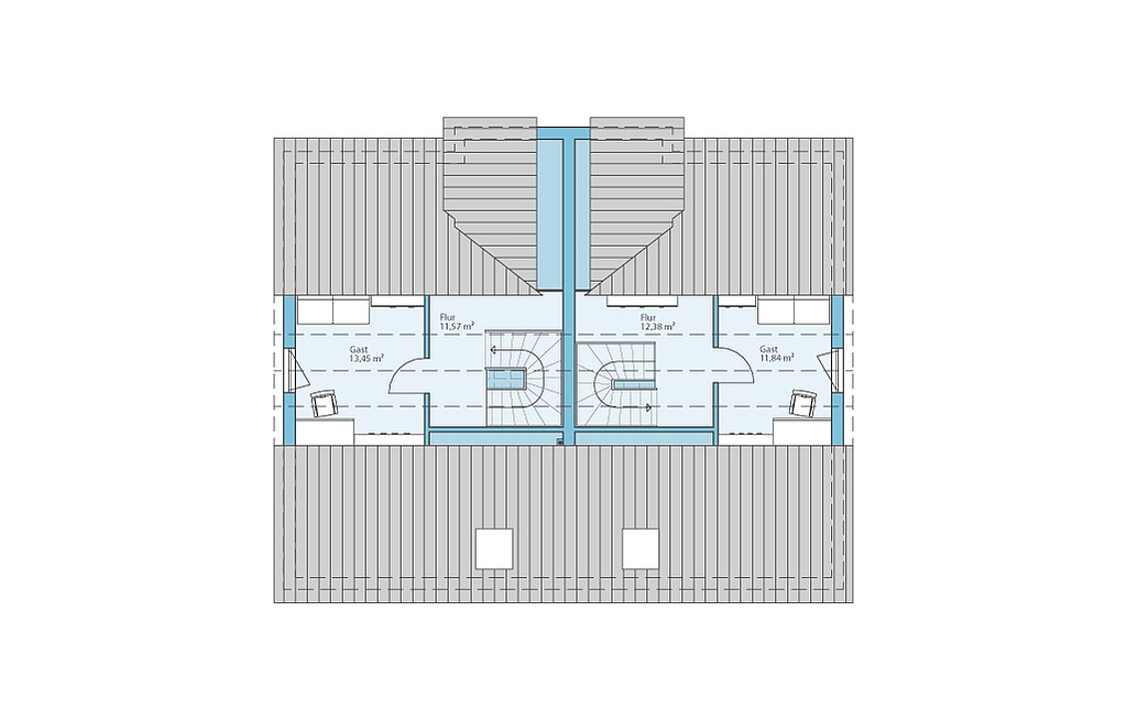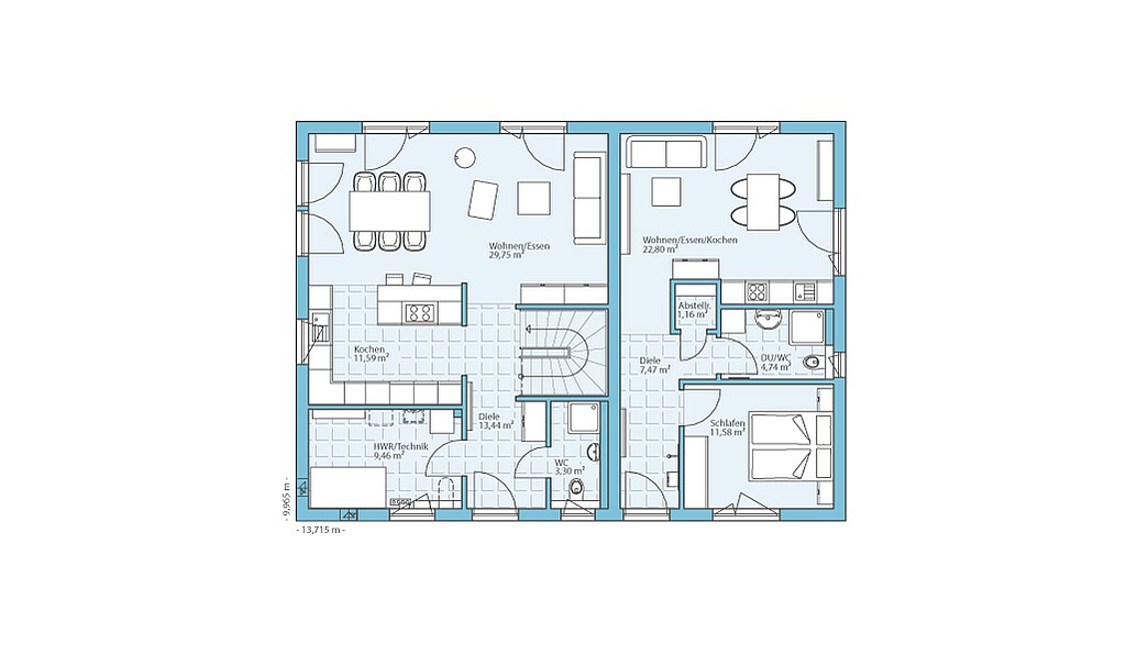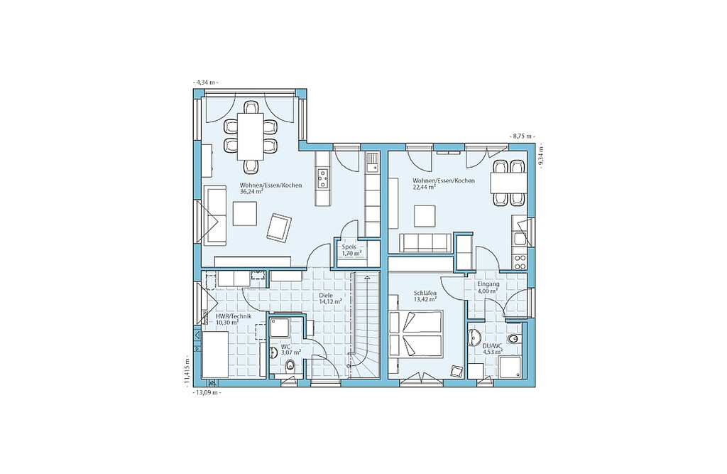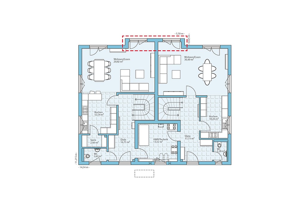 - Eine der Wohnungen kann ausschließlich im Erdgeschoss geplant werden, während die andere sich über zwei Stockwerke verteilt (z.B. als eine Art Einliegerwohnung)