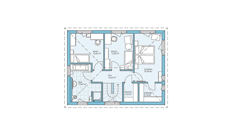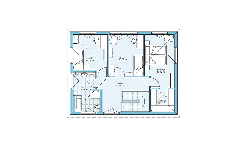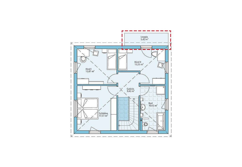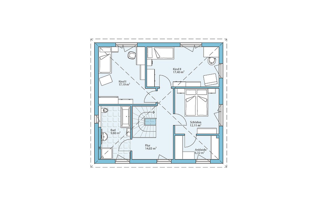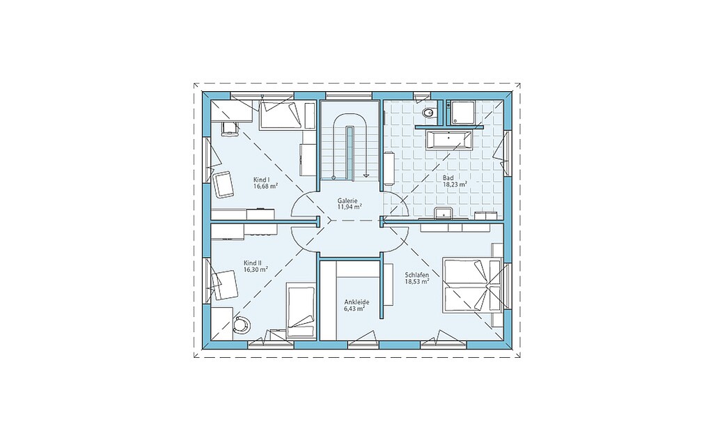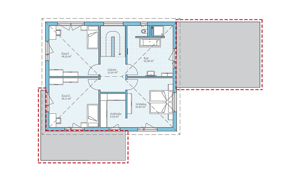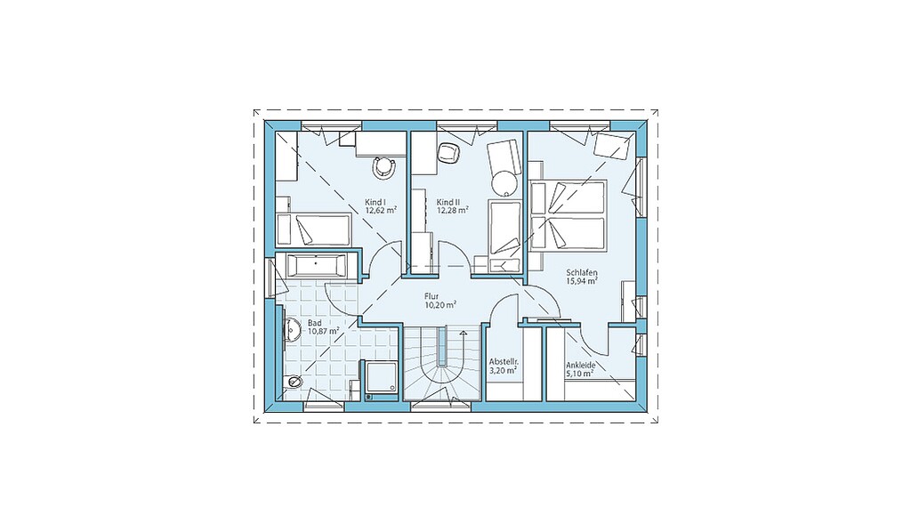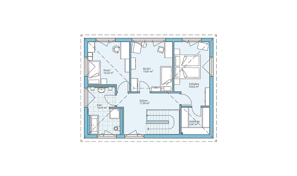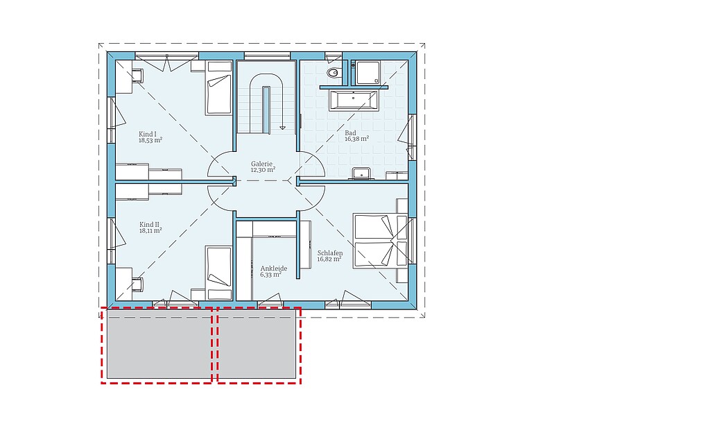 - Aufgrund der zwei Vollgeschosse können Sie auch im Obergeschoss den kompletten Raum sinnvoll nutzen und verlieren durch Dachschrägen keinen wertvollen Raum. Die Zimmer können daher problemlos kleiner geplant werden.
