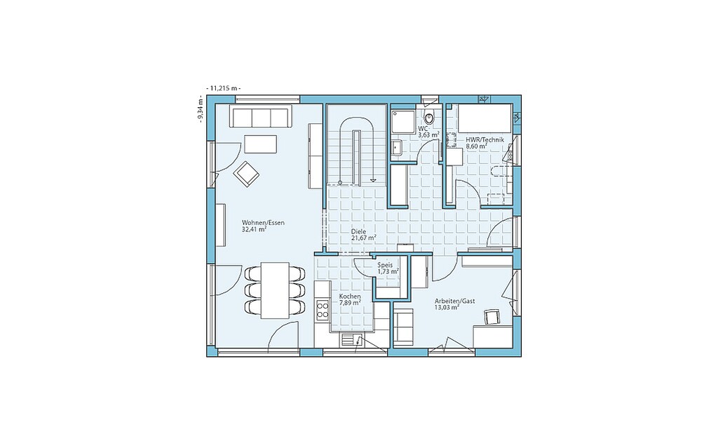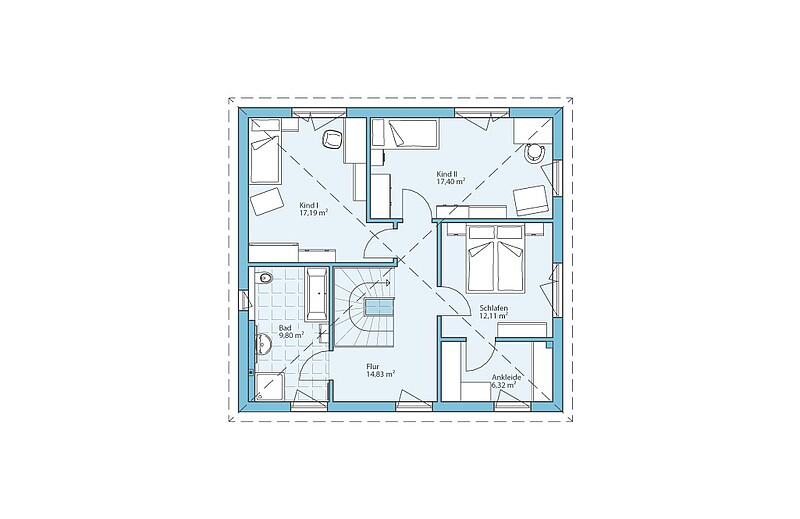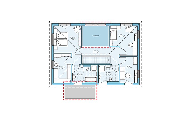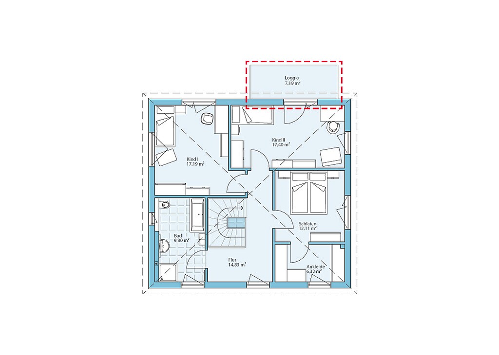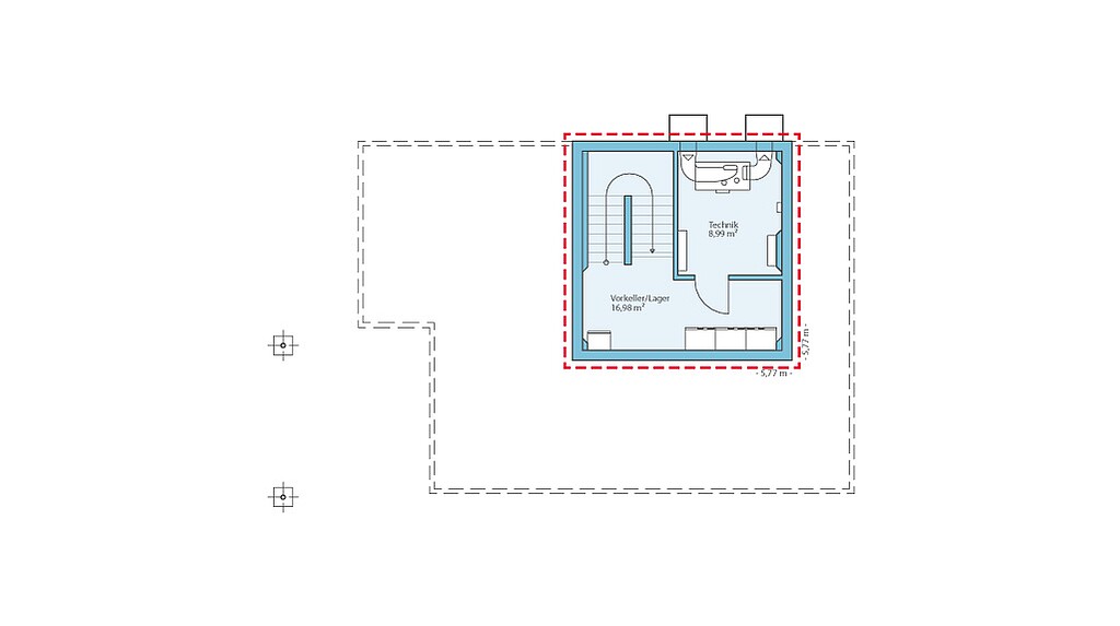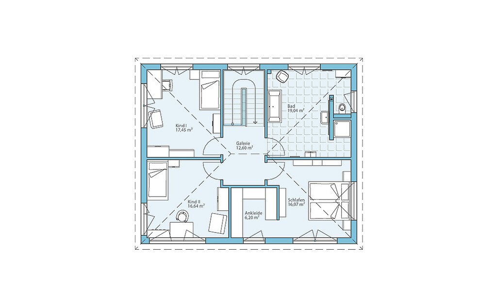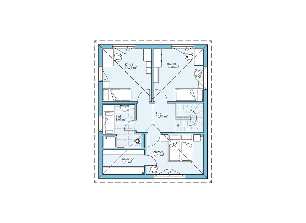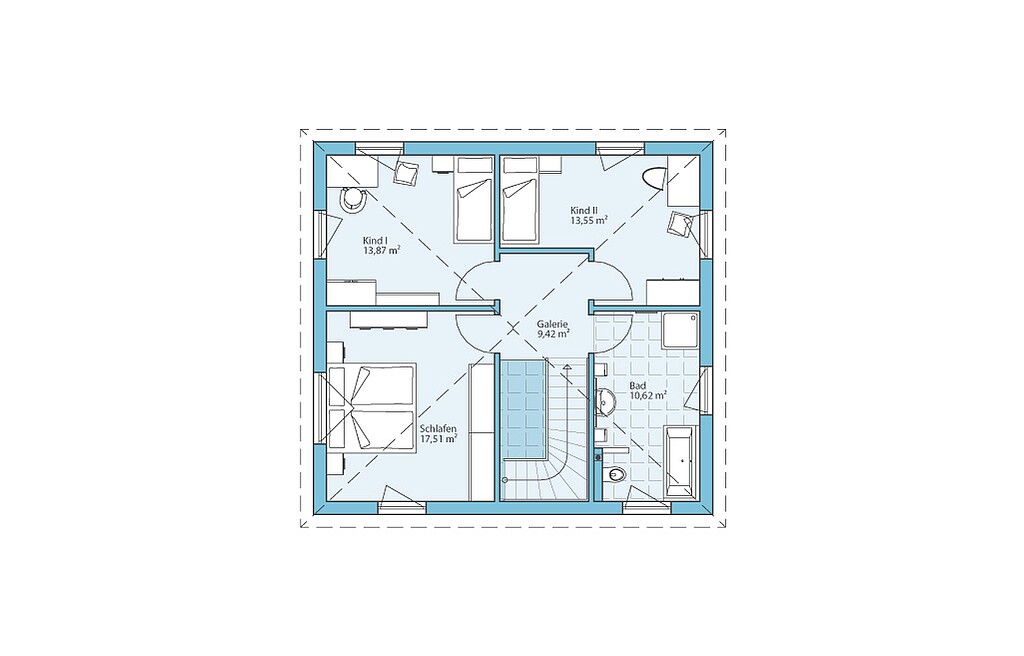 - Aufgrund der zwei Vollgeschosse können Sie auch im Obergeschoss den kompletten Raum sinnvoll nutzen und verlieren durch Dachschrägen keinen wertvollen Raum. Die Zimmer können daher problemlos kleiner geplant werden.