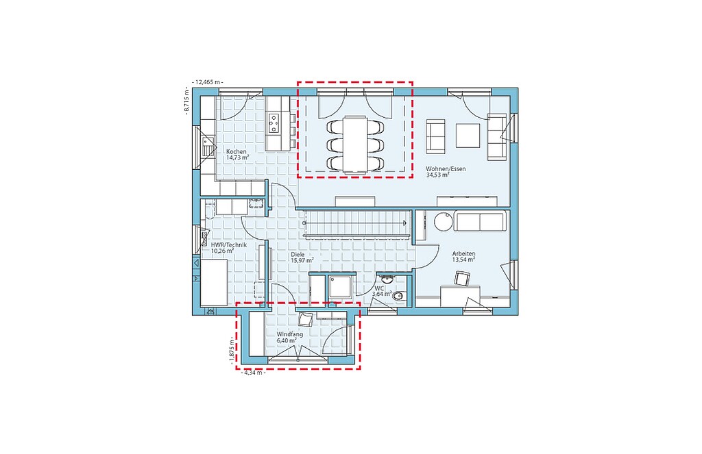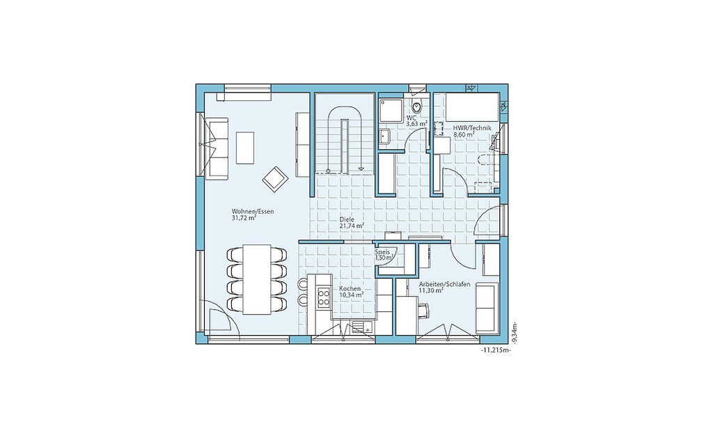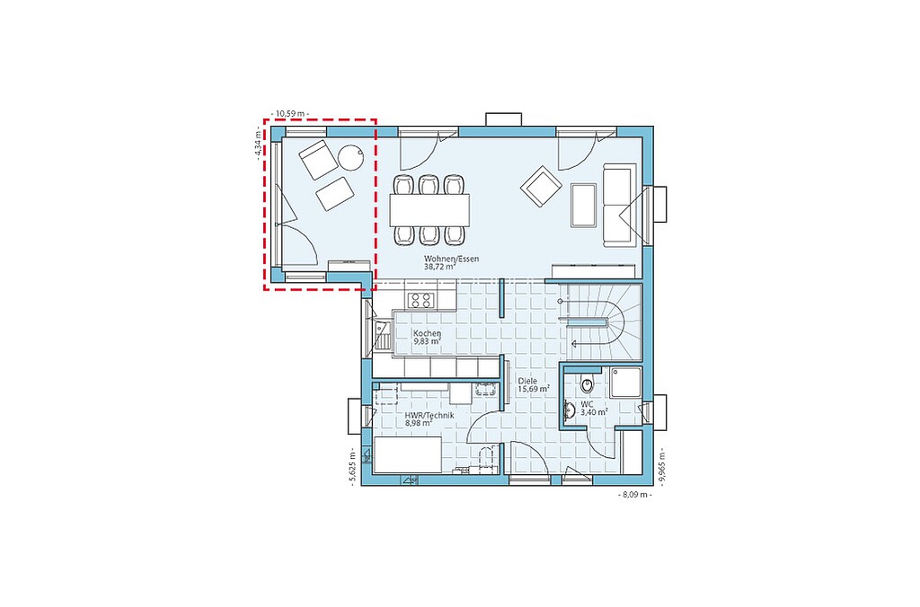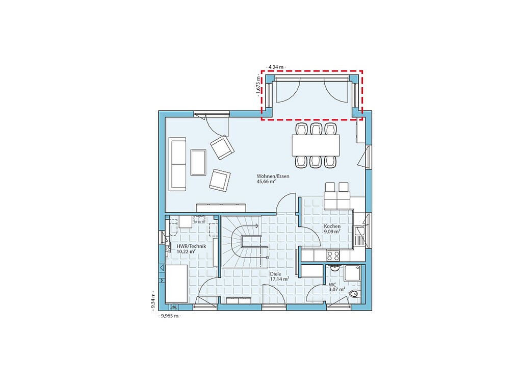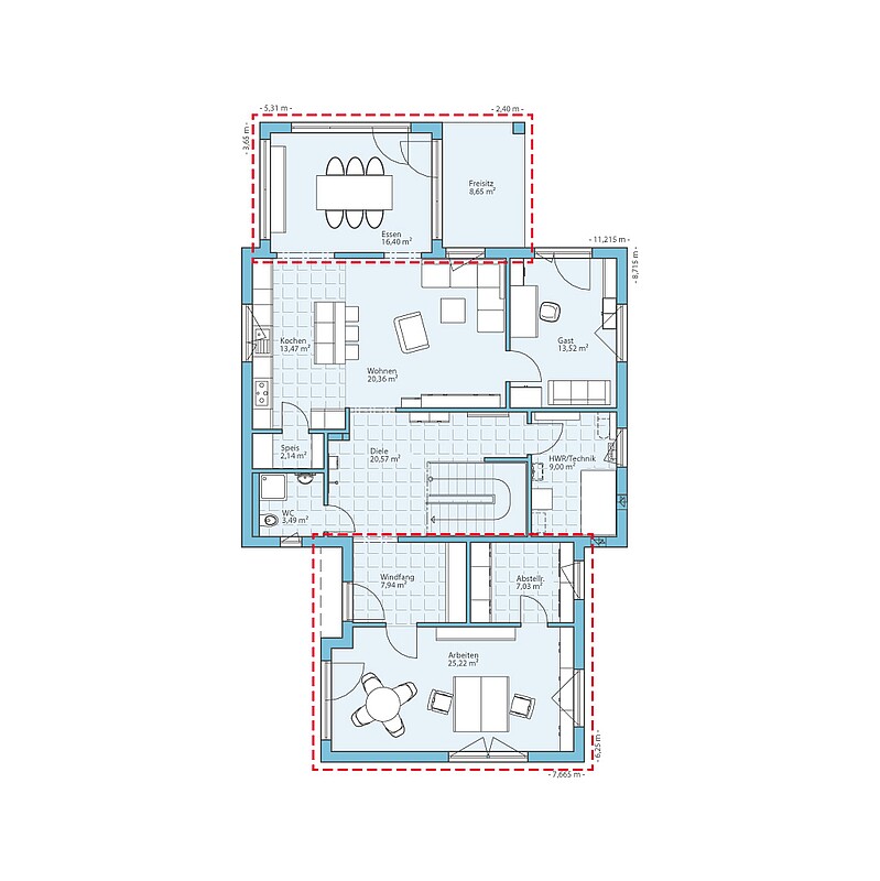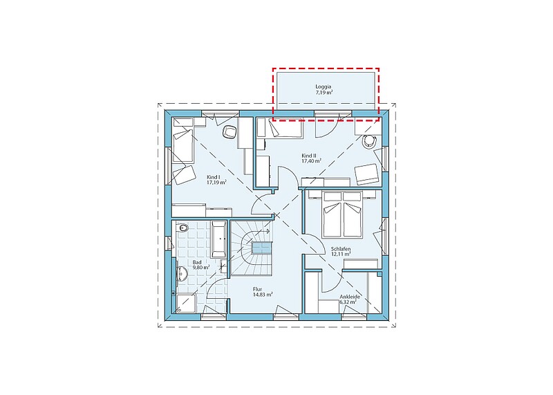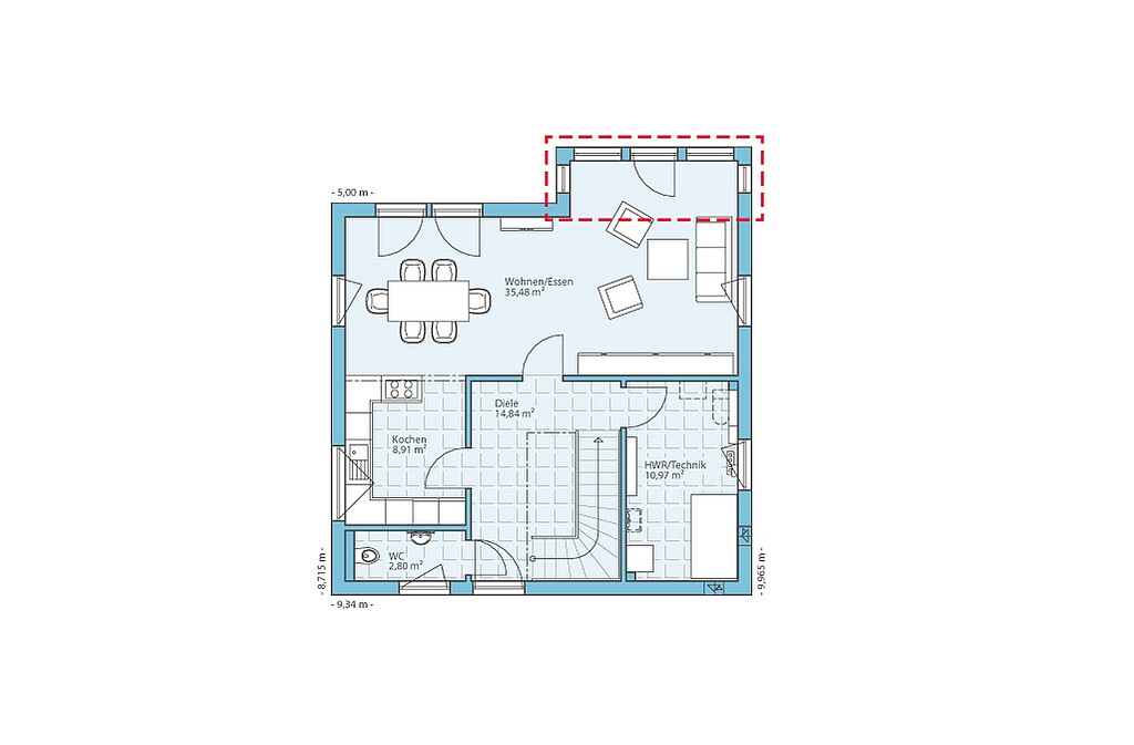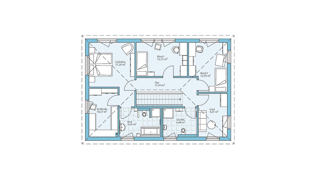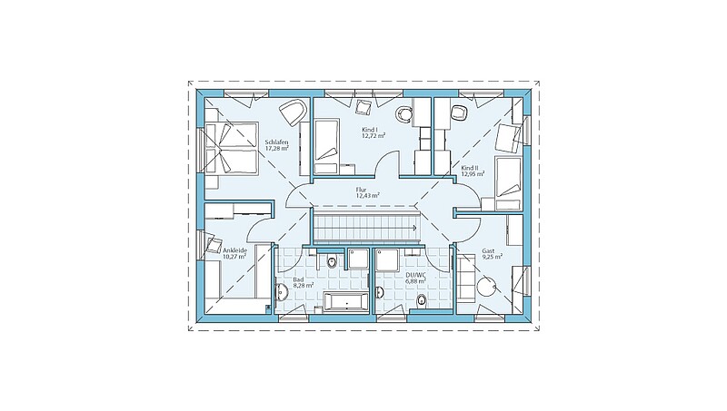 - Aufgrund der zwei Vollgeschosse können Sie auch im Obergeschoss den kompletten Raum sinnvoll nutzen und verlieren durch Dachschrägen keinen wertvollen Raum. Die Zimmer können daher problemlos kleiner geplant werden.