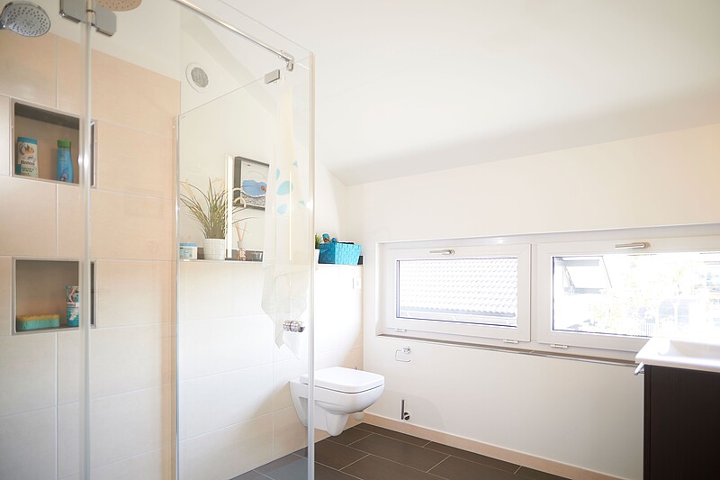 Ausserdem ist es sinnvoll, die Toilette direkt unterhalb des Badezimmers einzuplanen. So müssen die Zu- und Abwasserrohre keine langen Wege durch das Haus nehmen.