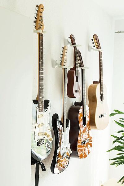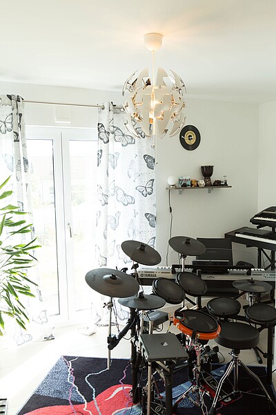 Aber mit einem schönen Platz im Wohnzimmer für das Klavier war es noch nicht getan. „Wir haben uns ein eigenes Musikzimmer gegönnt! Mit Platz für Ann-Kathrins Keyboards, mein elektronisches Schlagzeug und die Gitarrensammlung samt Verstärkern. So können wir jederzeit spielen, ohne immer alles auf- und abbauen zu müssen – das ist für uns echt Luxus!“, schwärmt Stefan Keller.