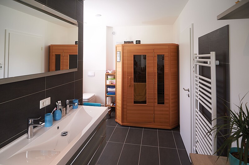 Da ist die Hauptwohnung mit WC, Garderobe, offener Küche, die an den repräsentativen Wohn-Ess-Bereich im „Anbau“ angrenzt, und dem klar gegliederten Obergeschoss: gen Osten der Arbeits-/Gästezimmer-Trakt samt Duschbad, gen Westen die ganz private Einheit der Bauherren (Ankleide, Schlafzimmer, raffiniertes Wellnessbad, unter anderem mit von zwei Seiten begehbarer Dusche und Wärmekabine für zwei Personen).