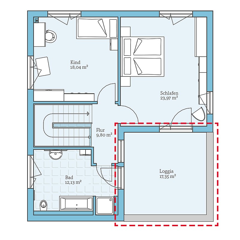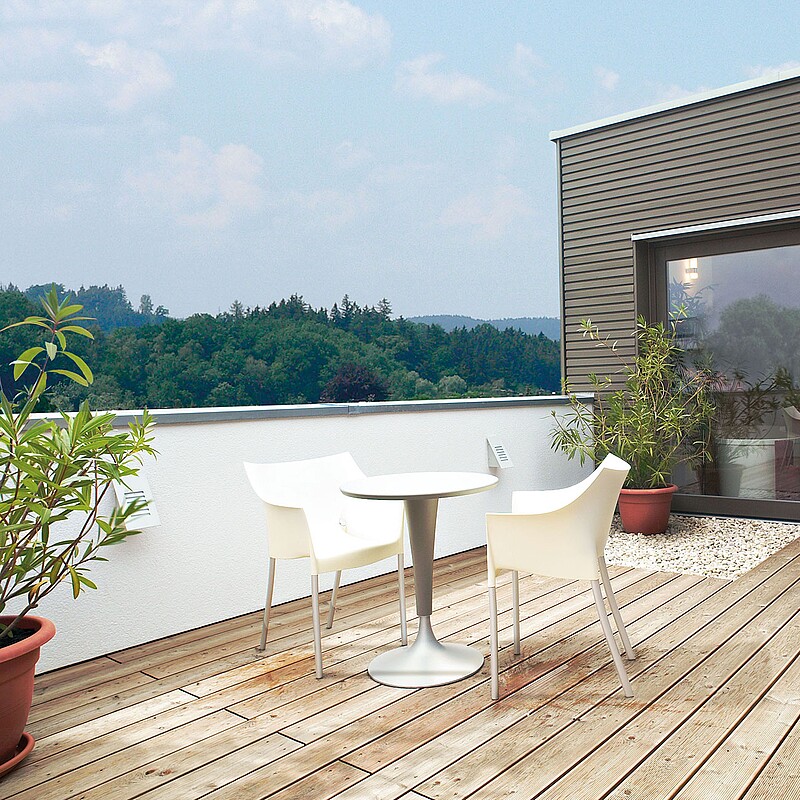 Das moderne Musterhaus mit Flachdach zeigt, wie sich ein ganzheitlich barrierefreies Wohnkonzept umsetzen lässt. Der offene, großzügige Grundriss mit 184 m² Wohnfläche bietet beste Voraussetzungen dafür. Das Highlight des Musterhauses ist die Loggia im Obergeschoss, die das Haus um einen geschützten Sitzplatz im Freien erweitert.