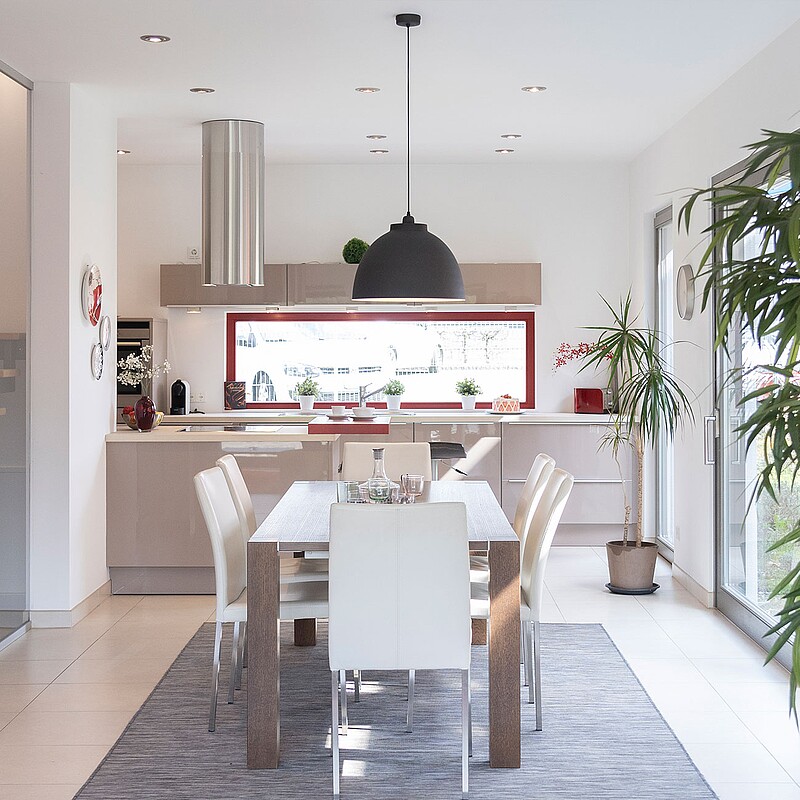 Klare Linien und eine sachlich gegliederte Architektur bestimmen den Charakter unseres Musterhauses in Suhr in der Schweiz. Im Inneren entstehen so viel Freiraum und helle Räume auf zwei Vollgeschossen.