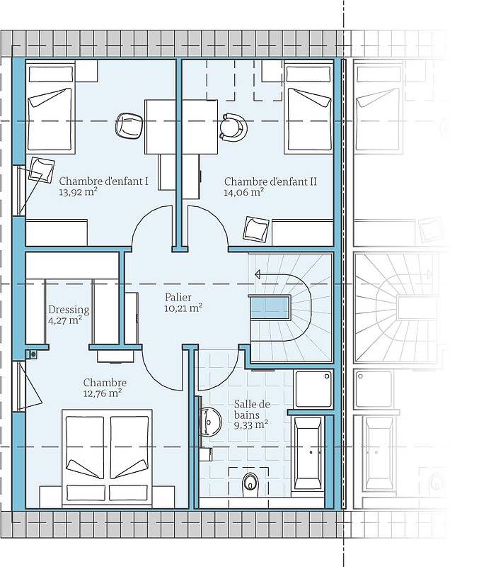 - Les grandes baies vitrées du pignon traversier optionnel laissent entrer encore davantage de lumière naturelle dans les chambres d'enfants. De l'extérieur aussi le pignon traversier est un véritable accroche-regard.
