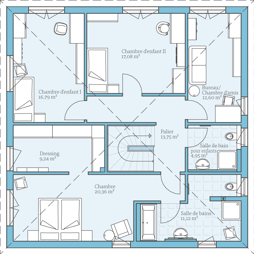 Ce modèle de maison est également une villa à deux étages avec un toit en croupe. Ici, l'appartement indépendant n'est cependant pas situé dans une annexe, mais dans le corps de la maison ce qui est judicieux d'un point de vue énergétique, car cela permet de réduire les coûts de chauffage. Les entrées de maison se trouvent sur deux côtés différents afin de préserver la sphère privée de chacun. À l'étage, il y a beaucoup d'espace pour une grande famille avec la possibilité d'aménager trois chambres d'enfants, une salle de bain séparée pour les enfants et un espace spacieux pour les parents.