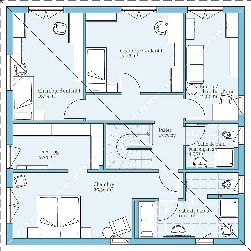 Ce modèle de maison est également une villa à deux étages avec un toit en croupe. Ici, l'appartement indépendant n'est cependant pas situé dans une annexe, mais dans le corps de la maison ce qui est judicieux d'un point de vue énergétique, car cela permet de réduire les coûts de chauffage. Les entrées de maison se trouvent sur deux côtés différents afin de préserver la sphère privée de chacun. À l'étage, il y a beaucoup d'espace pour une grande famille avec la possibilité d'aménager trois chambres d'enfants, une salle de bain séparée pour les enfants et un espace spacieux pour les parents.