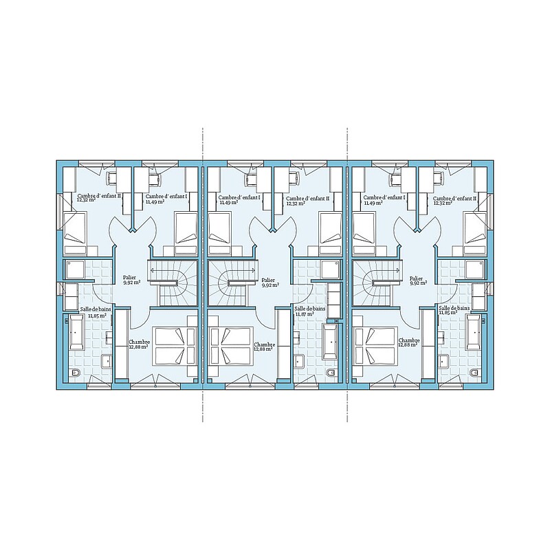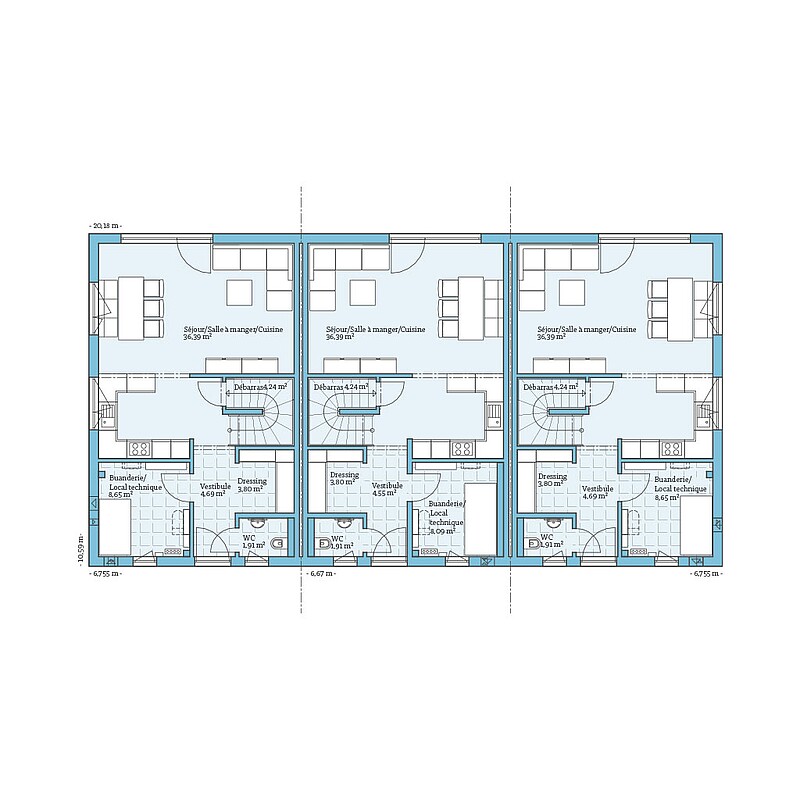 Créer beaucoup de logements sur le moins de terrain possible – une maison mitoyenne est la solution optimale pour cela. Nous montrons notre projet de proposition avec trois maisons. Mais il est également possible de construire quatre maisons ou plus.
