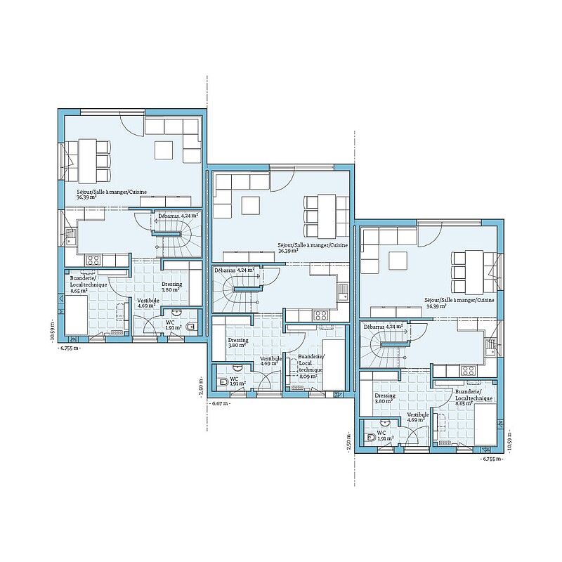 Une différence fondamentale entre les maisons mitoyennes est de savoir si elles sont construites en rangée droite ou déplacées. Ainsi, la maison mitoyenne est parfaitement adaptée à la forme des parcelles et à l'orientation de la route. Avec leurs près de 120 mètres carrés, les maisons peuvent déjà être mises en œuvre sur de petites parcelles à partir de 300 mètres carrés.