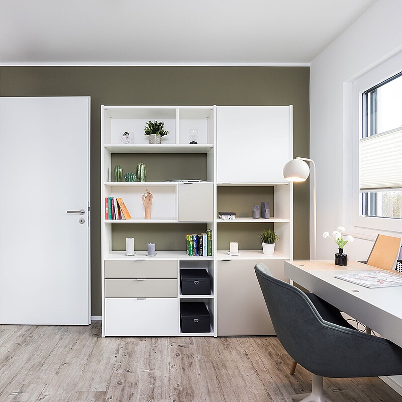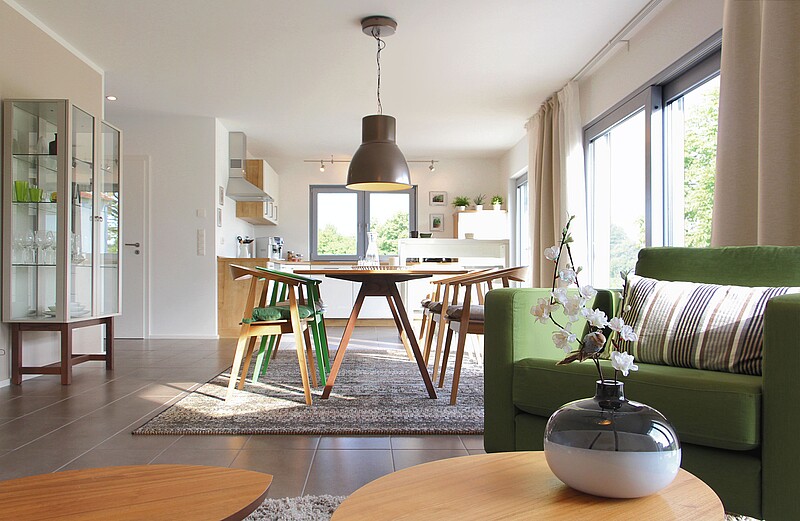 Dans notre Variant 25-183, les espaces de séjour, salle à manger et cuisine sont disposés en forme de L : la table à manger est située dans le coin le plus lumineux de la pièce et est ainsi reliée à la cuisine et au salon, lesquels sont néanmoins séparés visuellement l'un de l'autre.