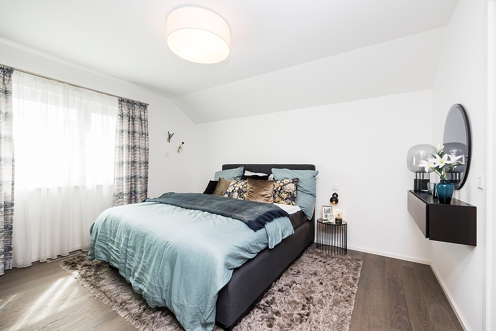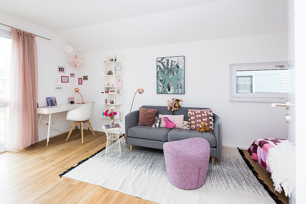 Les chambres du dernier étage comprennent une grande salle de bain bien-être avec baignoire et douche. Les chambres d'enfants sont également dimensionnées de sorte que ces derniers puissent se sentir à l'aise, jusqu'à l'adolescence dans leur nouvelle habitation. La buanderie se situe sous les combles: chose pratique puisque c'est également à cet endroit que le linge se trouve et est rangé. Grâce à cette configuration, un espace de rangement supplémentaire est libéré dans le local technique du rez-de-chaussée.