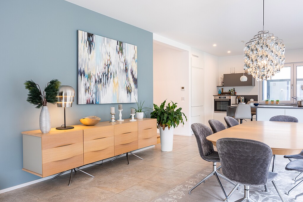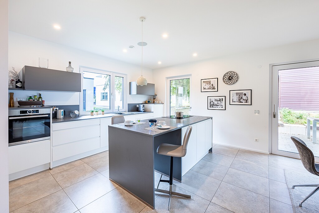Si votre souhait est d'avoir une maison qui offre beaucoup d'espace, nos maisons de la série Variant 25 sont toujours un bon choix. Avec une plus grande variété de plans possibles, la maison témoin de Fellbach offre à tous ceux qui aiment bénéficier de beaucoup l'espace, près de 200 mètres carrés répartis sur les deux niveaux. L'espace ouvert de la cuisine/séjour, est avec une superficie totale d'environ 55 mètres carrés, le lieu central des activités quotidiennes de la maison et vous invite à cuisiner, à manger ou à faire la fête ensemble.