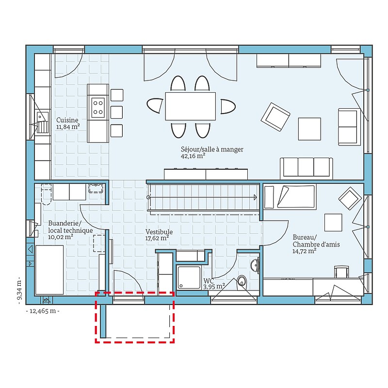 - Vous avez la possibilité d'agrandir l'espace réservé à l'entrée en y ajoutant un toit au niveau de la porte. Le toit plat moderne s'intègre parfaitement au caractère de la maison et le panneau mural protège du vent et des intempéries.