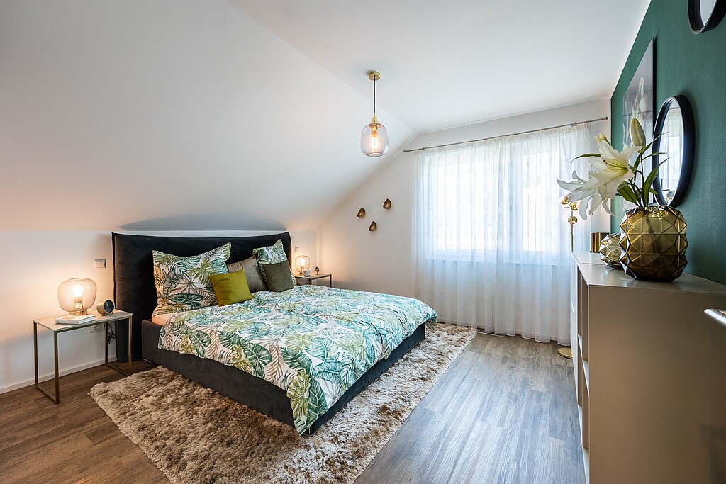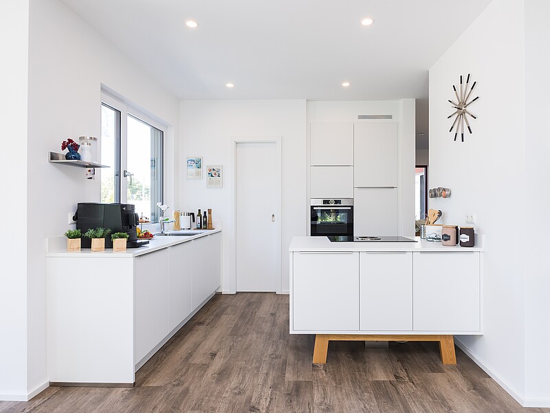 La maison témoin du modèle Variant 35-161 à Mannheim, par exemple, a été agrandie pour inclure une grande véranda vitrée dans l'espace de séjour. Celle-ci offre ainsi un bel espace lumineux pour une longue table à manger. Une extension a été rajoutée sur le côté de l'entrée de la maison pouvant accueillir un studio ou un bureau. Si vous n'avez pas besoin d'un studio comme pièce supplémentaire, vous pouvez également l'envisager comme espace pour en faire un garage avec un accès direct à la buanderie. Les possibilités en matière d'aménagement de l'espace sont en réalité presque infinies. Et c'est notre mission de trouver la solution idéale qui vous convienne et corresponde le plus justement.