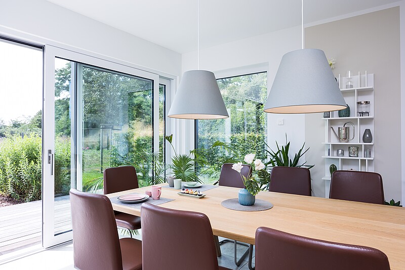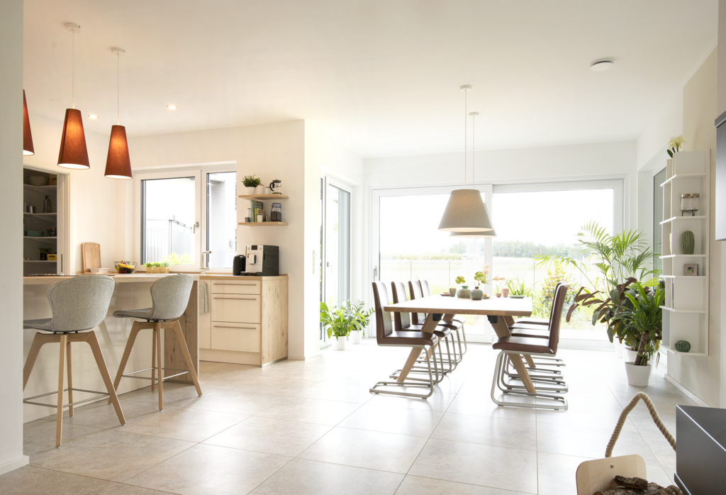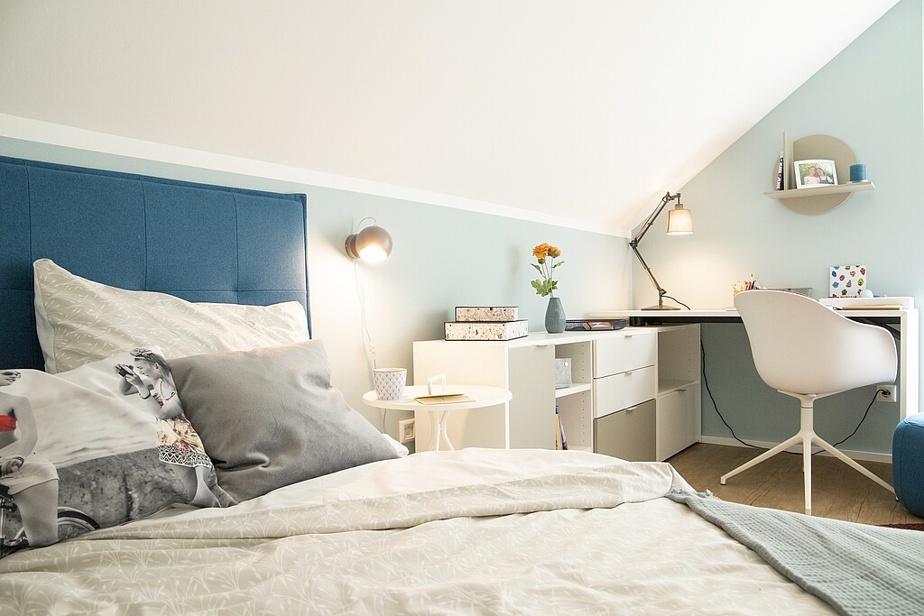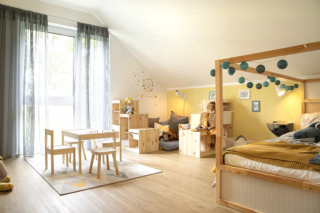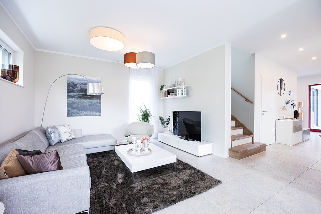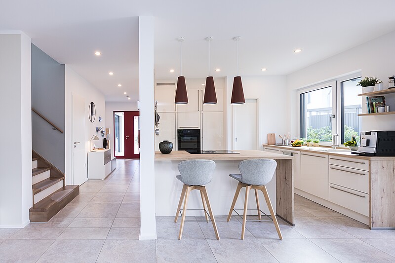 Le cœur de la maison Variant 35-163 est l'espace ouvert du salon, de la salle à manger et de la cuisine. Dans notre maison témoin de Dresde, un oriel vitré crée un espace supplémentaire et permet de faire entrer beaucoup de lumière. Avec une hauteur sous coude de 140 cm, la maison dispose d'un étage supérieur spacieux qui, outre une chambre à coucher avec dressing attenant et deux chambres d'enfants, peut également accueillir une salle de bains spacieuse destinée à la détente.