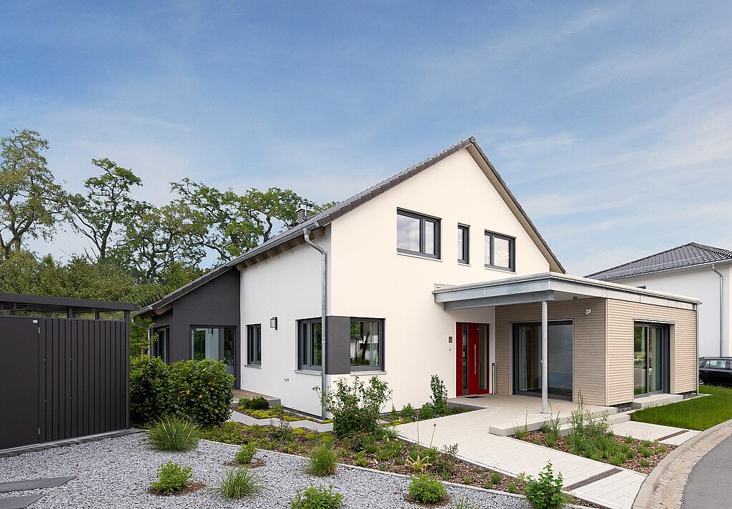 Vous pouvez très facilement reproduire les plans de votre maison afin de les adapter à la disposition de votre terrain et de les orienter de manière optimale en fonction des points cardinaux. Un exemple: notre maison modèle Variant 35-163, qui peut être visitée dans le parc Unger à Dresde, est une réplique de notre maison modèle Variant 35-161 à Mannheim.