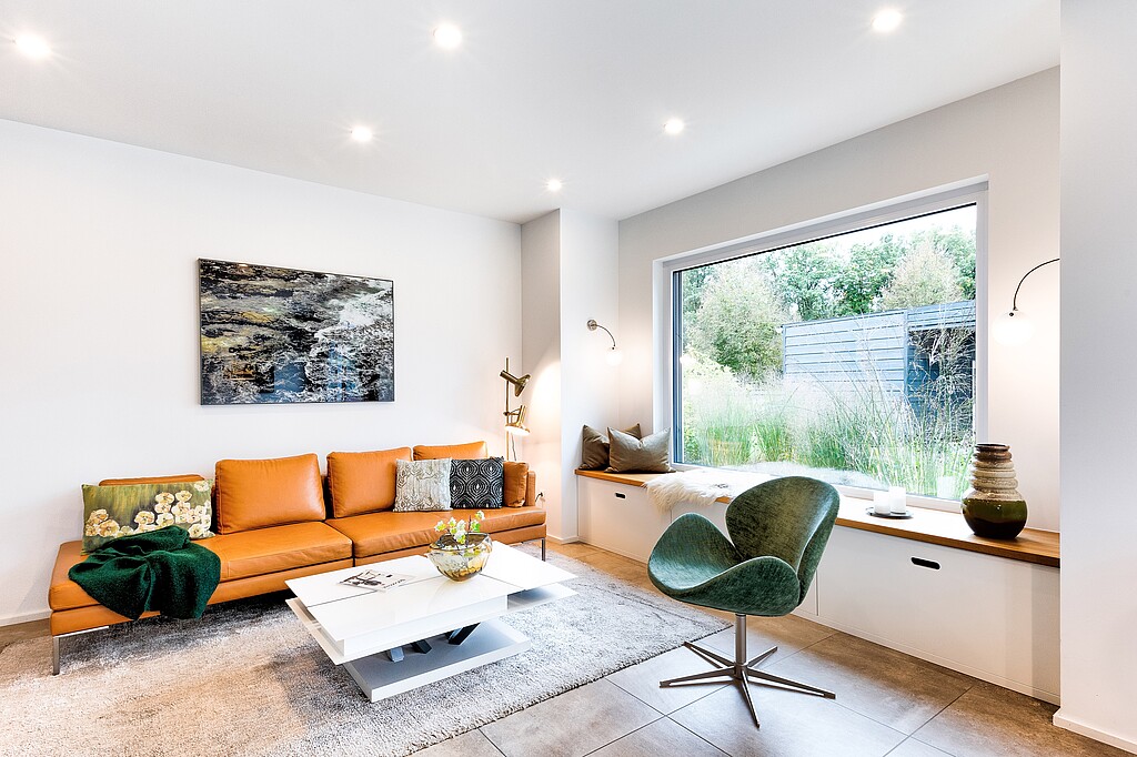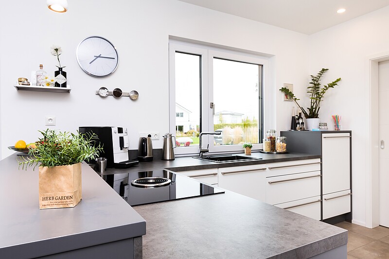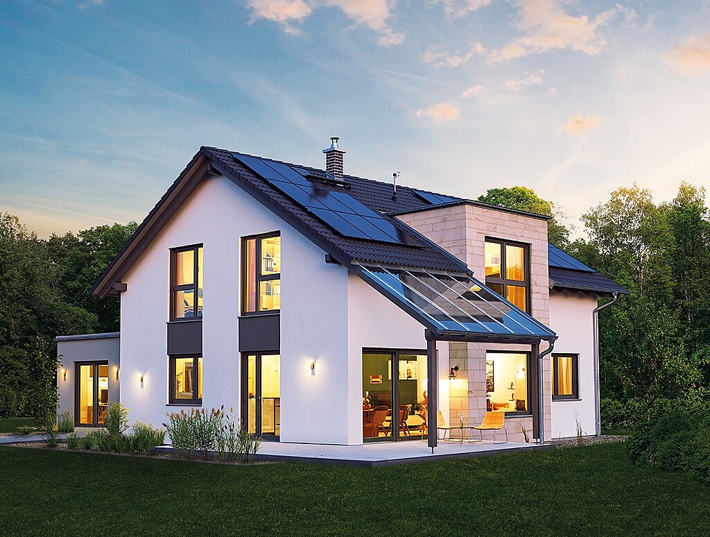 Voici votre nouvel espace de vie et de bien-être. La conception de la maison Variant 35-172 montre une fois de plus comment l'architecture classique des toits à pignon peut être conçue de manière moderne et contemporaine. Le plâtre blanc pur, associé à des surfaces de couleur gris foncé et gris clair, apportent beaucoup de style. La façade en grès sur le pignon traversier crée un contraste prononcé et naturel en même temps. Les grandes surfaces vitrées captent la lumière du jour et créent une atmosphère agréable et de bien-être