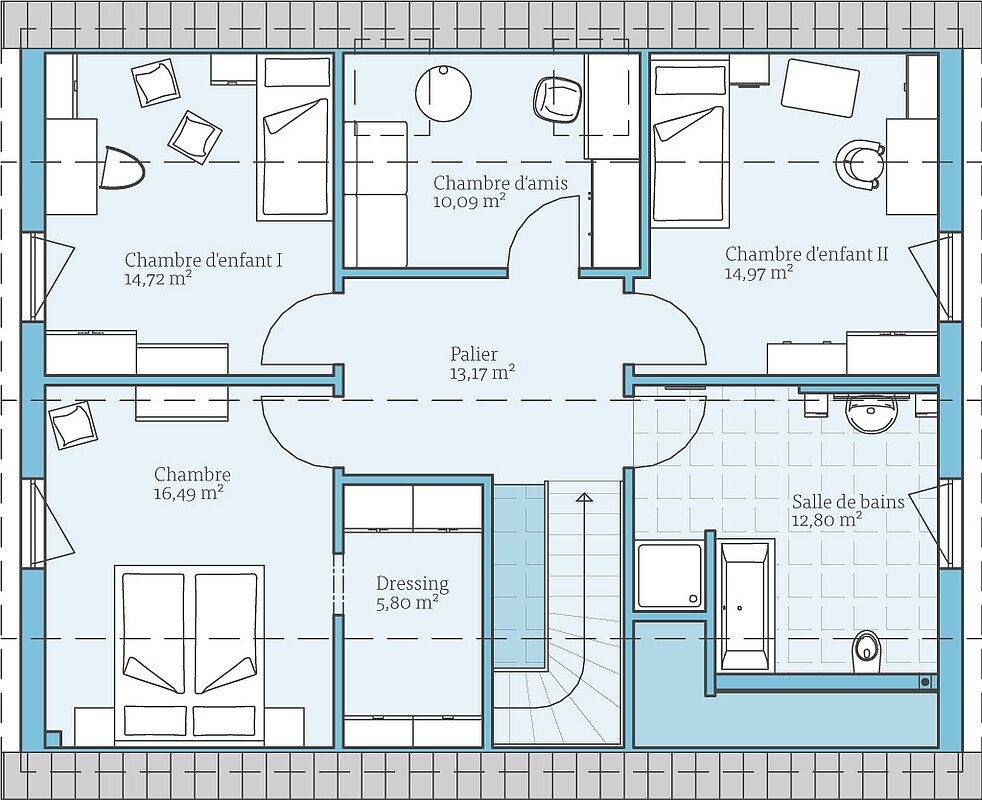 Avec ce modèle de Variant aussi, il est possible de vivre avec toute la famille, grâce à une large superficie de 184 m². Le rez-de-chaussée séduit par son espace salon/salle à manger/cuisine ouvert. Sous les combles sont prévus la salle de bain familiale, la chambre principale avec dressing et deux chambres d'enfants.