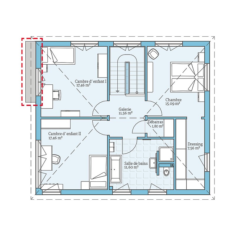 Un escalier à palier mène à l'étage supérieur et se prête parfaitement à la conception d'un espace de rangement en dessous, très pratique. À l'étage supérieur se trouvent deux chambres d'enfants spacieuses d'environ 17,5 m² et la chambre à coucher des parents avec un dressing tout en longueur. Une solution en T a été mise en œuvre dans la spacieuse salle de bains familiale: les toilettes sont ainsi cachées et la douche peut être carrelée sur trois côtés. Par ailleurs, il y a de la place à l'étage pour un autre débarras. Ce visuel montre à quel point il est possible de personnaliser une maison Hanse. La modernité intemporelle et les proportions harmonieuses se reflètent dans l'aspect visuel présenté ici: la couleur grise des fenêtres et le crépi blanc s'harmonisent avec la petite extension de l'espace de vie contrastée par les briques rouges classiques.