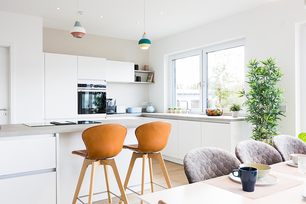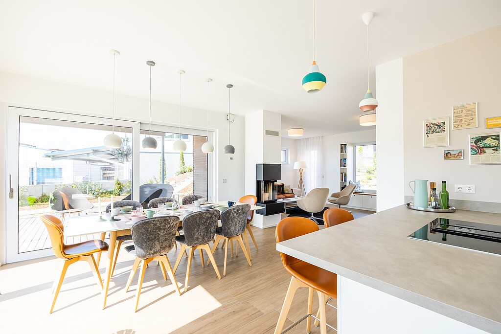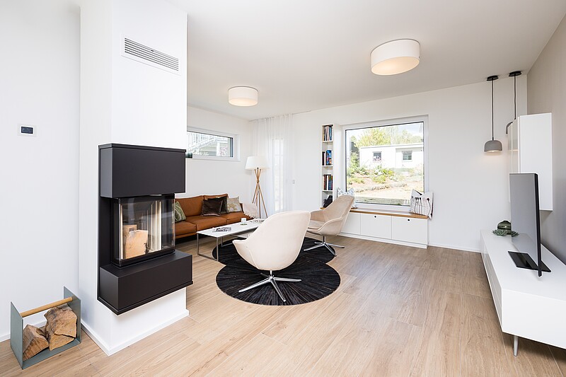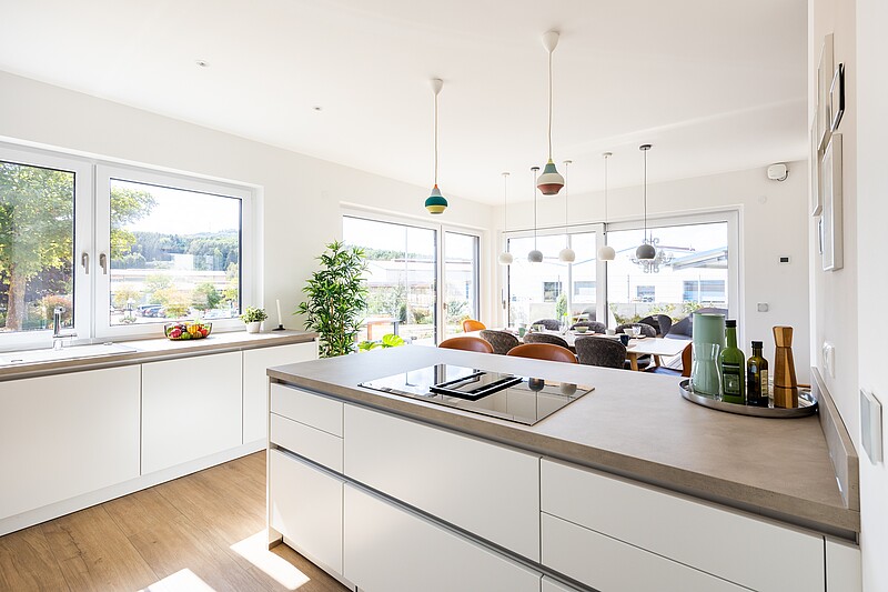 Dans cette conception et par rapport au plan de la maison témoin de Villingen-Schwenningen, une extension a été ajoutée à l'espace de vie du rez-de-chaussée au lieu de la cuisine. Il en résulte ainsi, non seulement une surface de vie plus importante, mais aussi la possibilité d'ajouter à l'extérieur un coin avec terrasse couverte – idéal pour un grand espace de repas.